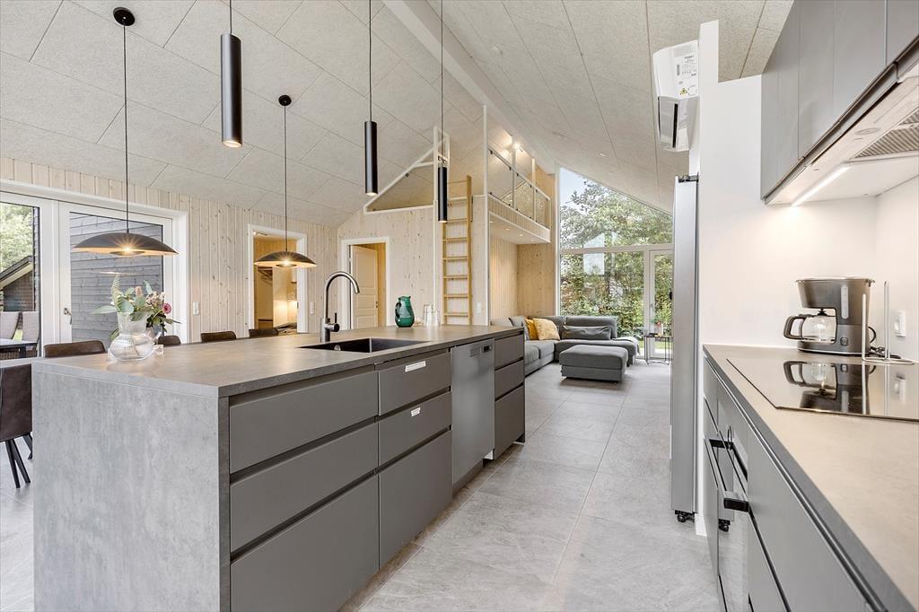 Dieses moderne Aktivitätshaus aus dem Jahr 2022, liegt nur 350 Meter vom schönen Fjellerup Strand entfernt. Es ist die perfekte Wahl für einen herrlichen Urlaub mit Familie oder Freunden. Das Haus bietet vier geräumige Schlafzimmer mit Doppelbetten. Eines der Schlafzimmer verfügt zusätzlich über einen TV für ein extra bisschen Luxus. Außerdem gibt es Schlafplätze und einen gemütlichen Rückzugsort für Kinder auf den beiden Dachböden, die zusammen mit vier Matratzen ausgestattet sind. Das Herz des Hauses ist die einladende Küche, die mit einem hellen und freundlichen Essbereich sowie einer gemütlichen, "höhlenartigen" Wohnzimmernische kombiniert ist. Hier könnt ihr euch zu Spielen, Gesprächen, Büchern oder einem guten Film vor dem Fernseher zusammenfinden. Das Highlight des Hauses ist das Aktivitätszimmer, in dem ihr euch bei einer Runde Airhockey messen könnt. Dort gibt es auch einen weiteren Fernseher. Das Haus verfügt über zwei moderne Badezimmer, die während des gesamten Aufenthalts für Komfort sorgen. Es gibt auch einen praktischen Hauswirtschaftsraum mit Waschmaschine. Zwei Wärmepumpen sowie Fußbodenheizung der Firma Genvex sorgen im ganzen Haus für Behaglichkeit und Wärme. Dieses Ferienhaus ist ein kleines Juwel am Fjellerup Strand und lädt sowohl zu Entspannung als auch zu unterhaltsamen Aktivitäten ein – gemeinsam oder allein.