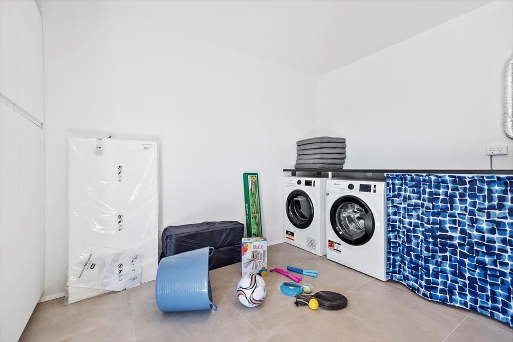 Der Eingangsbereich bietet ausreichend Platz zum Abstellen der Schuhe und zum Aufhängen der Jacken. Im angrenzenden Gebäude steht ein geräumiger Hauswirtschaftsraum zur Verfügung. Dieser beinhaltet eine Waschmaschine und einen Wäschetrockner und bietet Platz zum Abstellen von Kinderwagen, Fahrrädern und anderen derart sperrigen Gegenständen.