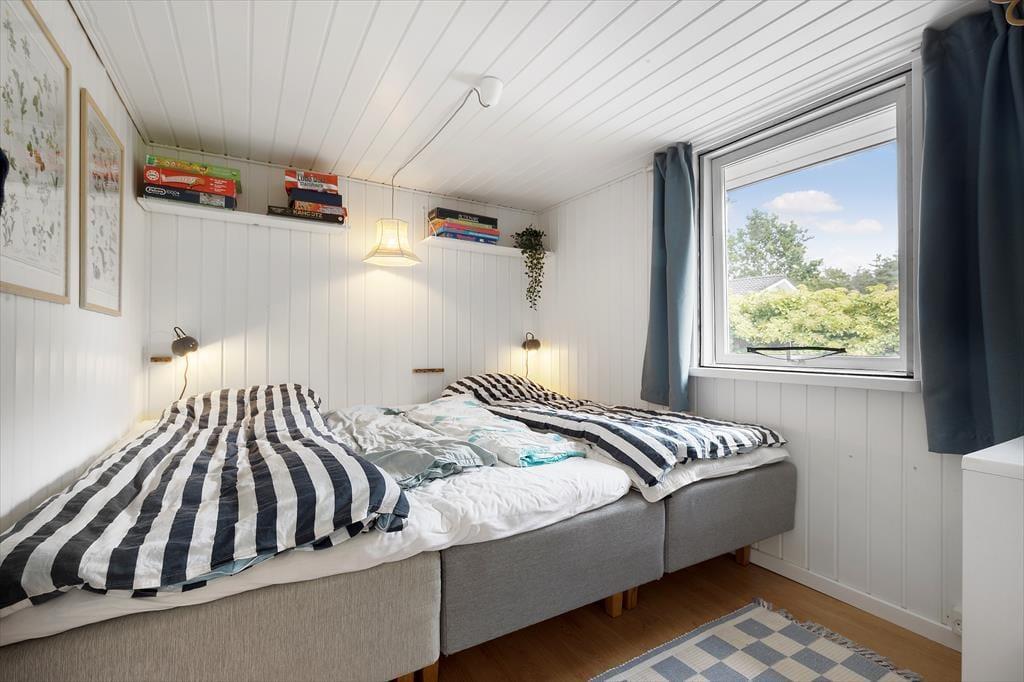 Viel Licht fällt durch die schönen Dachflächenfenster des Wohnraums und unterstreicht die schöne, leichte Ferienhausatmosphäre. Das Urlaubsdomizil wurde liebevoll instand gesetzt. Dabei wurde nicht an schönen Details und kreativen Lösungen gespart, zu denen beispielsweise die von der Decke herabhängenden Weingläser zählen. Die Küche präsentiert sich gemütlich und ansprechend. Sie verfügt über einen Geschirrspüler und drei transportable Kochplatten - zwei Induktionskochplatten und eine Cerankochplatte - die du wunderbar mit hinaus auf die überdachte Terrasse nehmen kannst, um dort die Mahlzeiten zuzubereiten oder Waffeln zu backen. Von der Küche gelangst du durch eine Tür hinaus auf eine herrliche Morgenterrasse, die sich bestens für einen frischen Becher Kaffee in den ruhigen, friedvollen Morgenstunden anbietet. Dein Ferienhaus bietet zwei Schlafräume; in dem einem steht ein Doppelbett und in dem anderen Zimmer steht ein großes Bett bereit, in dem die jüngsten Urlauber sicher neben den Eltern schlafen können. Praktischerweise ist das Duschbadezimmer deines Ferienhauses mit einer Waschmaschine versehen, dank der du dir unnötig viel Reisegepäck ersparen kannst.
