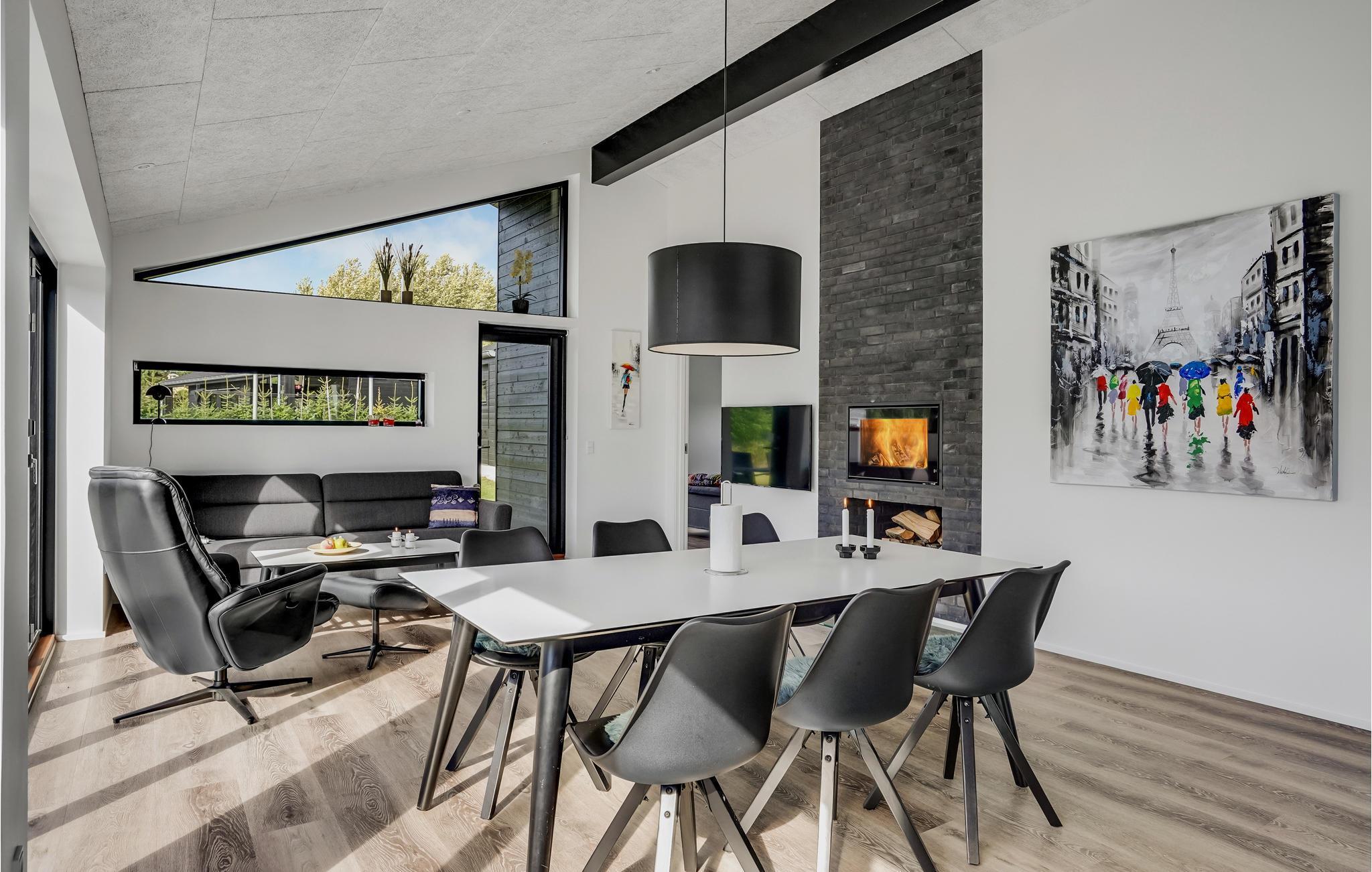 Stilvolles, komfortables Ferienhaus nahe Sandstrand mit Kamin, Aktivitätsraum und finnischem Holzbad in Glesborg, Dänemark.