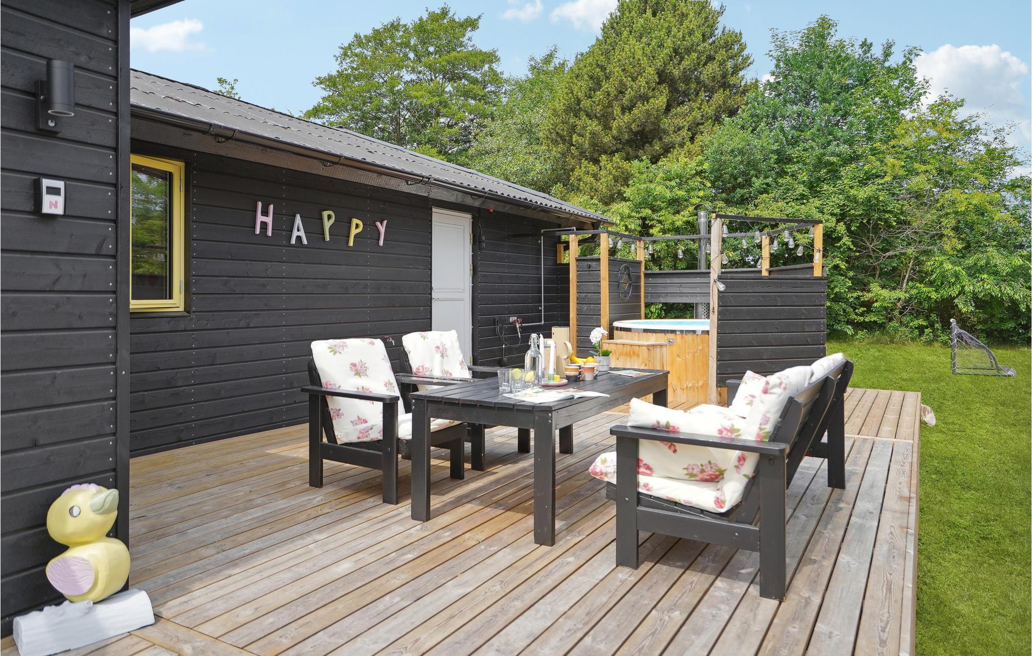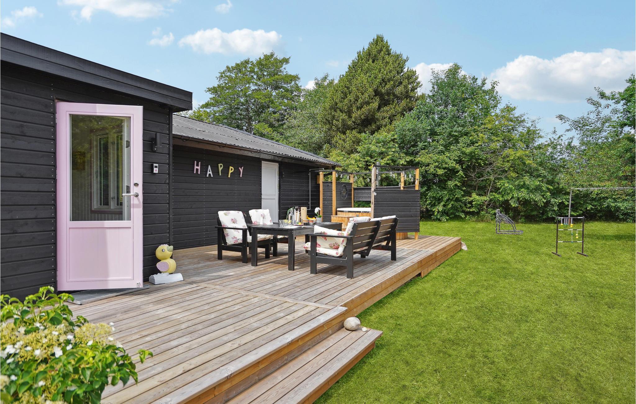 Gemütliches Ferienhaus in Fjellerup nahe Sandstrand mit großer Küche, Holzterrasse und vielen Spielmöglichkeiten im Garten.