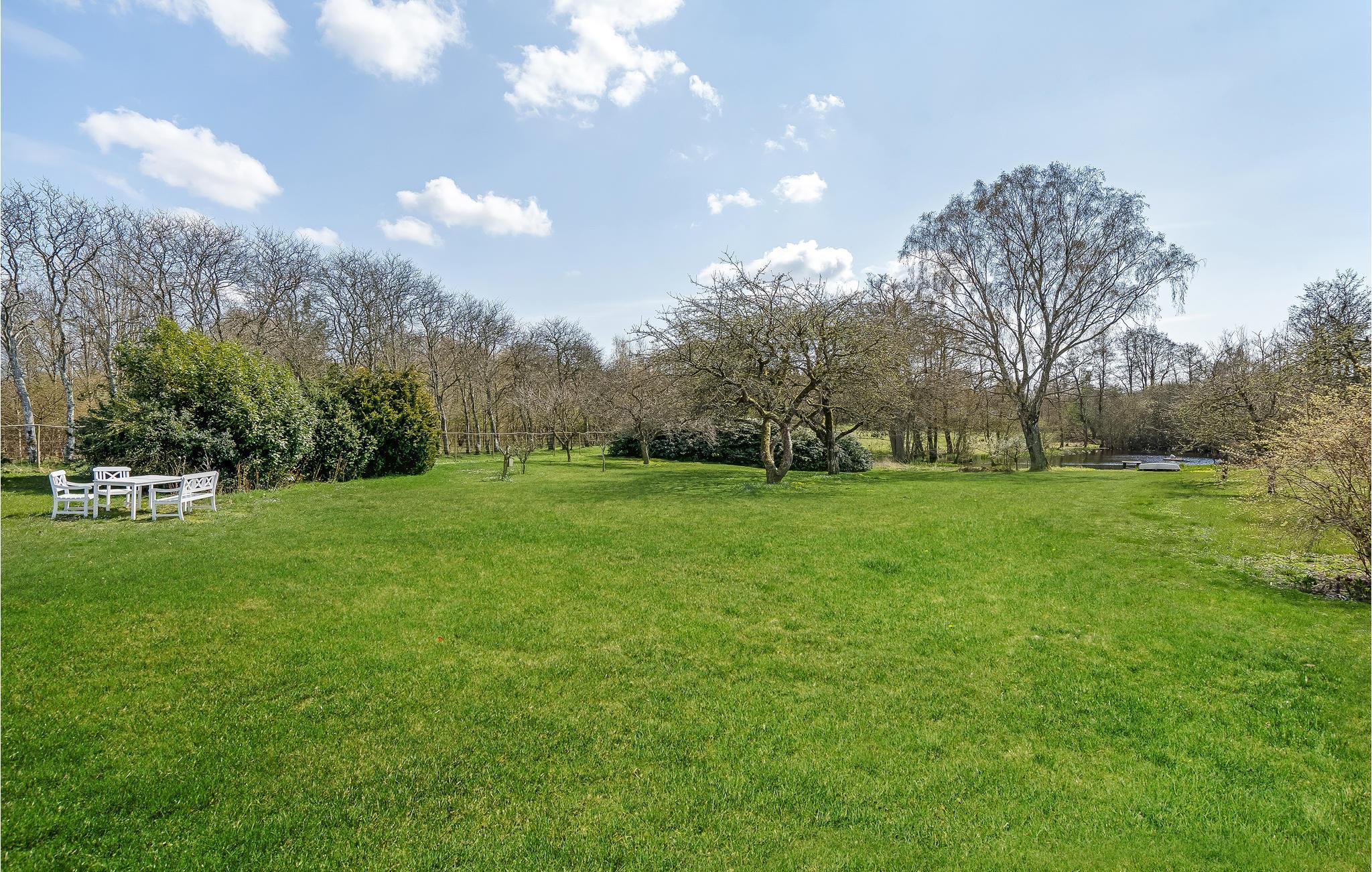 Vom Wohnbereich gelangen Sie auf die offene Terrasse mit Gartenmöbeln, die einen schönen Blick ins Grüne und auf das Grundstück mit See bietet. Genießen Sie ruhige Momente auf der Terrasse mit einem guten Buch oder einem Brettspiel mit der Familie und schalten Sie vom Alltag ab. Auf dem großen Grundstück, mit Zaun, der das Rotwild fernhält, werden Sie viel Platz zum Spielen finden.