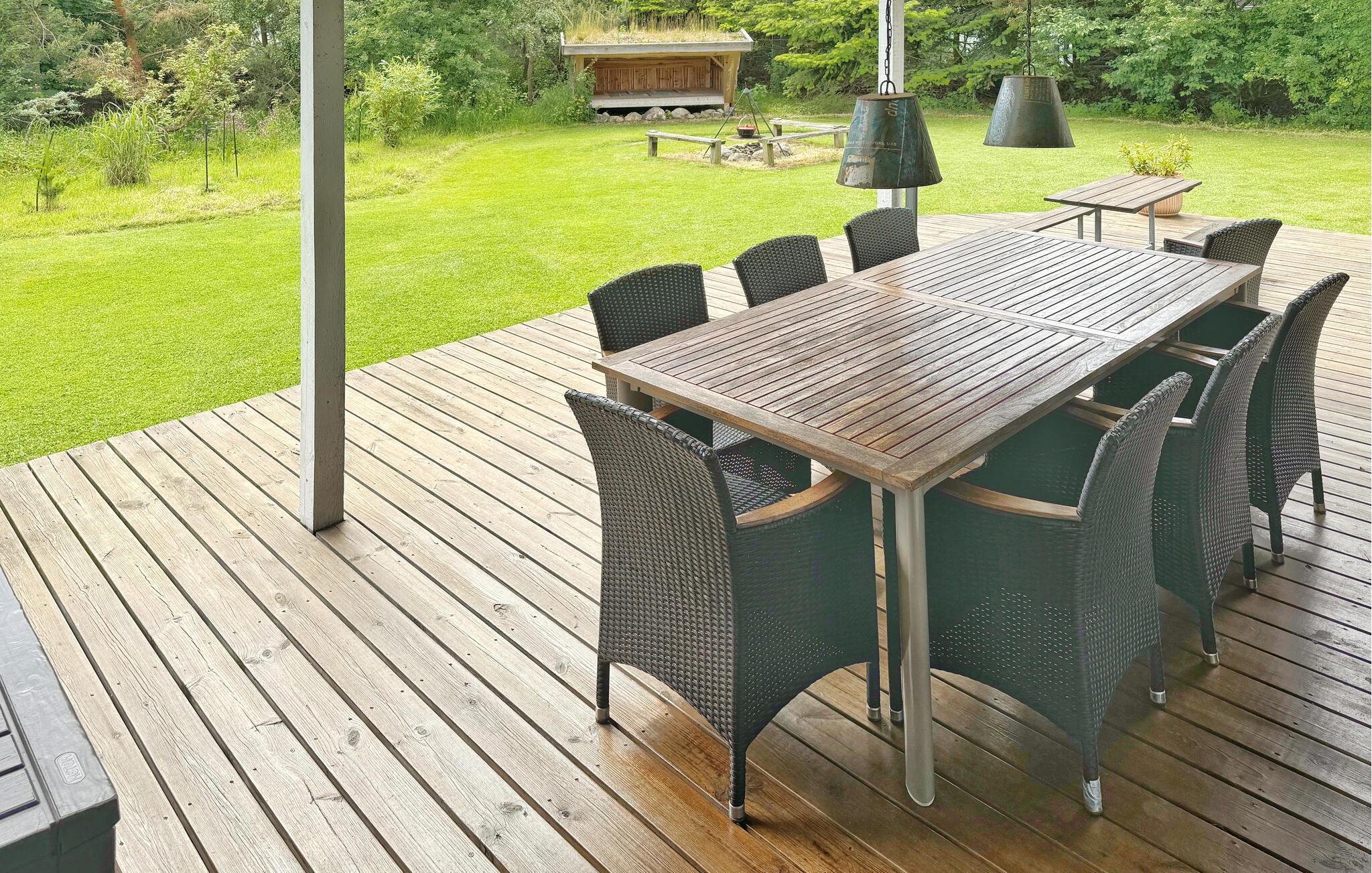 Dieses helle, komfortable und gemütliche Ferienhaus liegt auf einem Naturgrundstück mit Spielplatz und Lagerfeuer, nur fünf Gehminuten vom familienfreundlichen Sandstrand entfernt. Auf der nach Osten gerichteten Terrasse können Sie die Morgensonne, auf der größeren Südwestterrasse Nachmittagssonne und Sonnenuntergang in bequemen Gartenmöbeln genießen. Im Badefass für fünf Personen im Garten können Sie herrlich entspannen.
