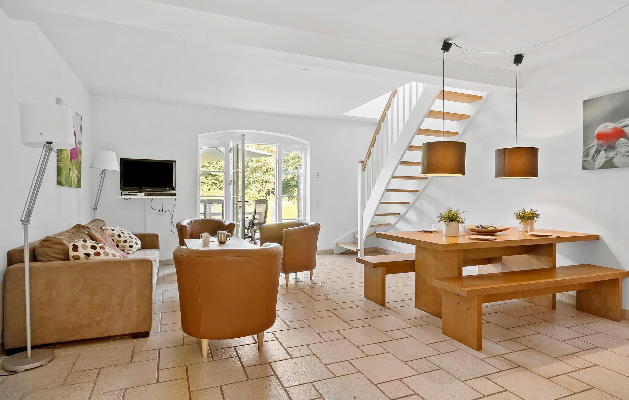 In dieser Ferienwohnung verbringen Sie eine unbeschwerte Zeit, umgeben von weiter Natur und herrlicher Landschaft. Entspannen Sie im freundlich eingerichteten Wohnbereich mit bequemen Sitzmöbeln und direktem Zugang zur Terrasse. Genießen Sie gemeinsame Stunden am Esstisch oder bereiten Sie Ihre Mahlzeiten in der schönen Küche zu, die Ihnen moderne Geräte und viel Arbeitsfläche bietet. Die helle Raumgestaltung sorgt für eine angenehme Atmosphäre, in der Sie sich sofort willkommen fühlen.