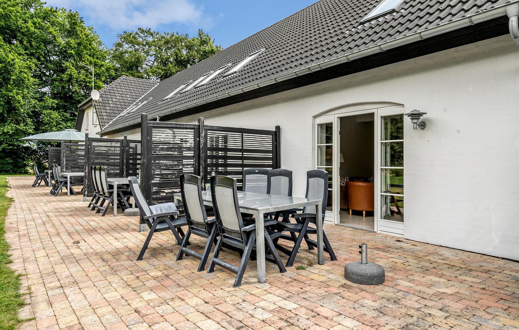Verbringen Sie Zeit im weitläufigen Außenbereich. Frühstücken Sie auf der privaten Terrasse mit Sitzgruppe und Sonnenschirm oder lassen Sie den Tag bei einem Glas Wein ausklingen. Nutzen Sie die großzügige Rasenfläche für Freizeitaktivitäten oder entspannen Sie einfach mit Blick auf die grüne Umgebung. Überdachte Bereiche mit langen Holzbänken bieten sich auch für gesellige Runden an.