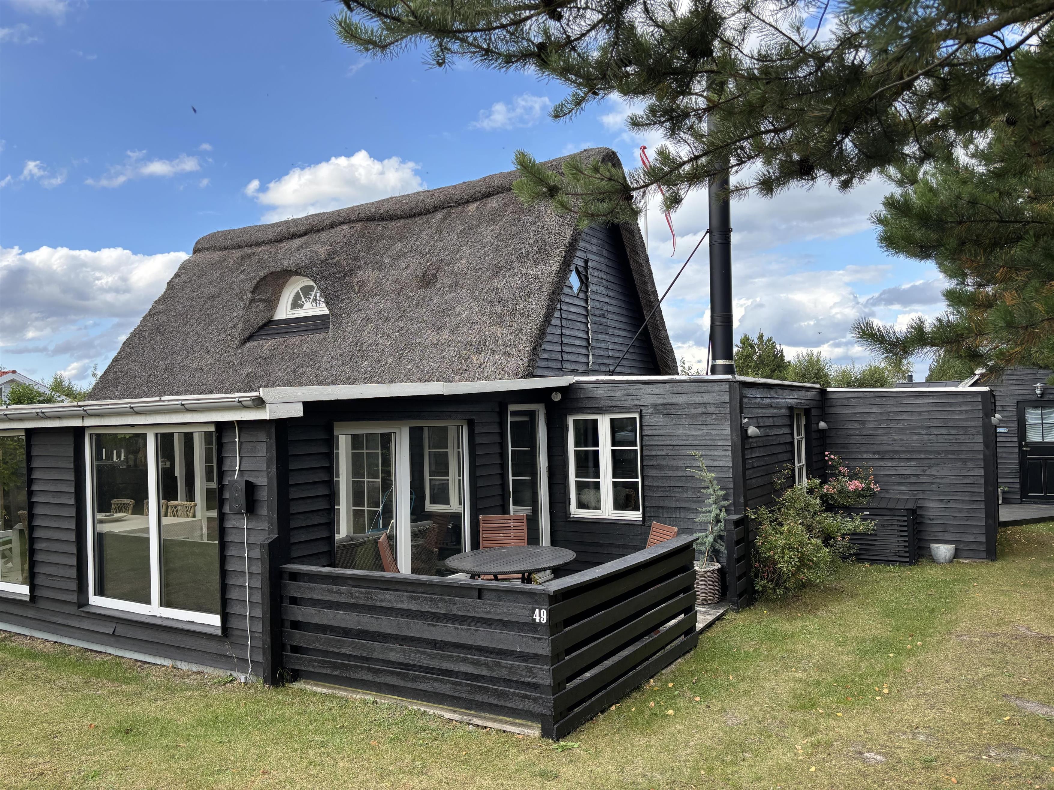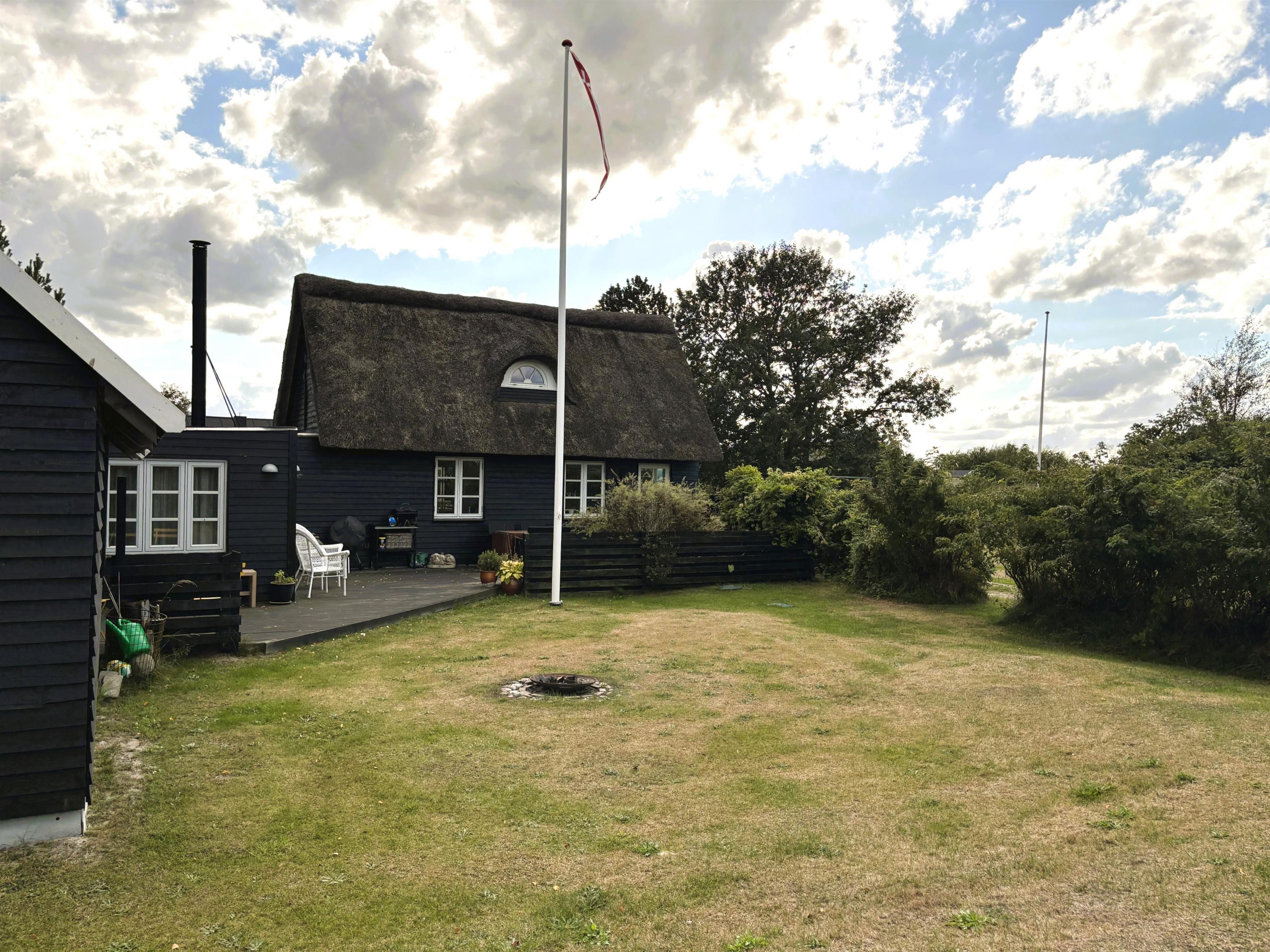 Im Außenbereich erwarten Sie mehrere gemütliche Sitzmöglichkeiten: eine kleine Terrasse mit Essbereich, eine große Holzterrasse mit Feuerstelle sowie versteckte Ecken zum Entspannen. Der grüne Rasen bietet viel Platz für Spiele und Outdoor-Aktivitäten für Kinder und Erwachsene. Außerdem gibt es auch eine Außendusche, sodass man sich nach einem Strandbesuch ganz einfach den Sand abspülen kann.