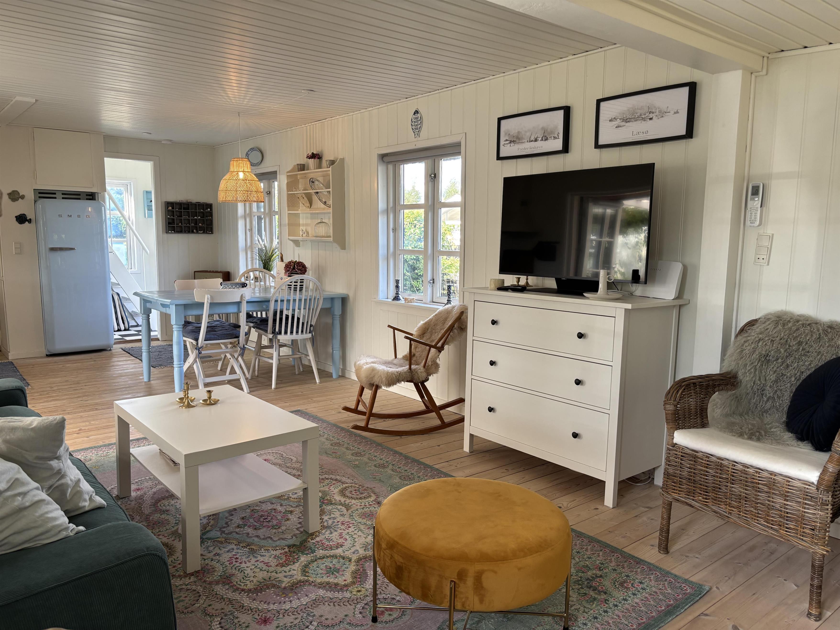 Das Ferienhaus ist romantisch und funktional eingerichtet, mit einem großzügigen Wohn- und Essbereich, der eine gemütliche Atmosphäre schafft – ideal für gemeinsame Stunden nach einem Tag am Strand. Im Erdgeschoss befinden sich außerdem ein Schlafzimmer mit Doppelbett sowie ein kleineres, aber voll funktionales Badezimmer mit Dusche.