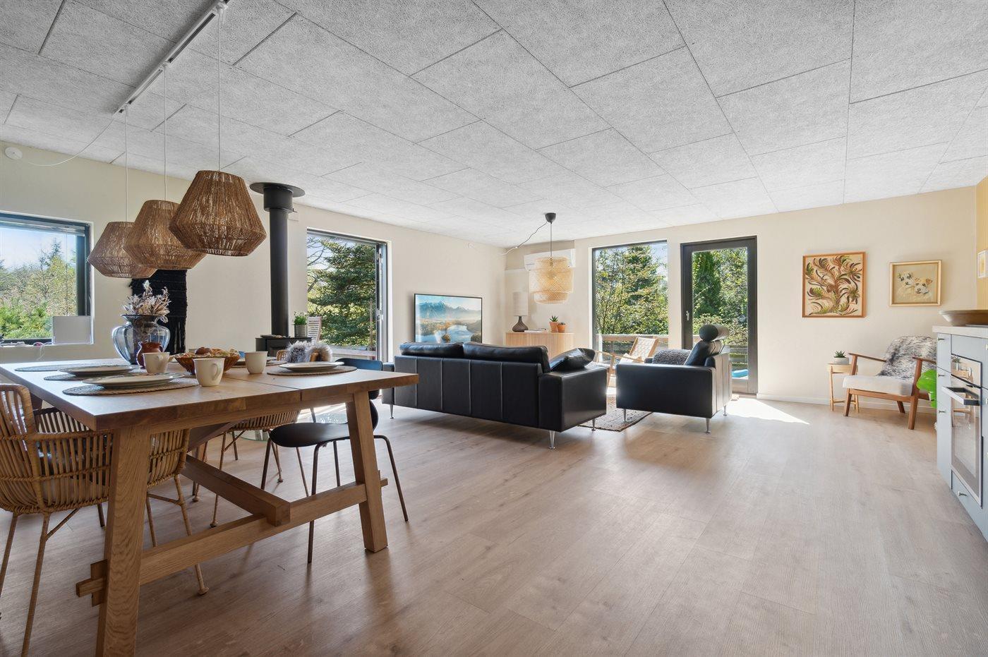 Modernes Ferienhaus nahe Wasser mit Hot Tub, großen Terrassen und Kaminofen für entspannte Tage in Fur, Dänemark.
