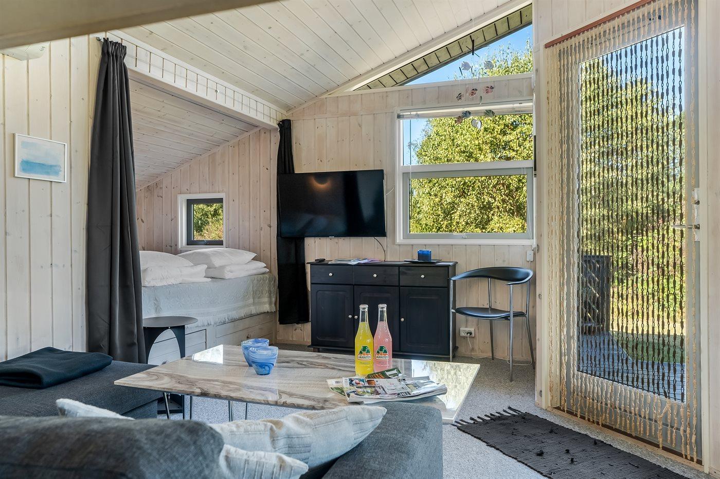 Gemütliches Ferienhaus auf Fur mit Sauna, Terrasse und Blick auf die Bucht, ideal für entspannte Urlaubstage in Dänemark.
