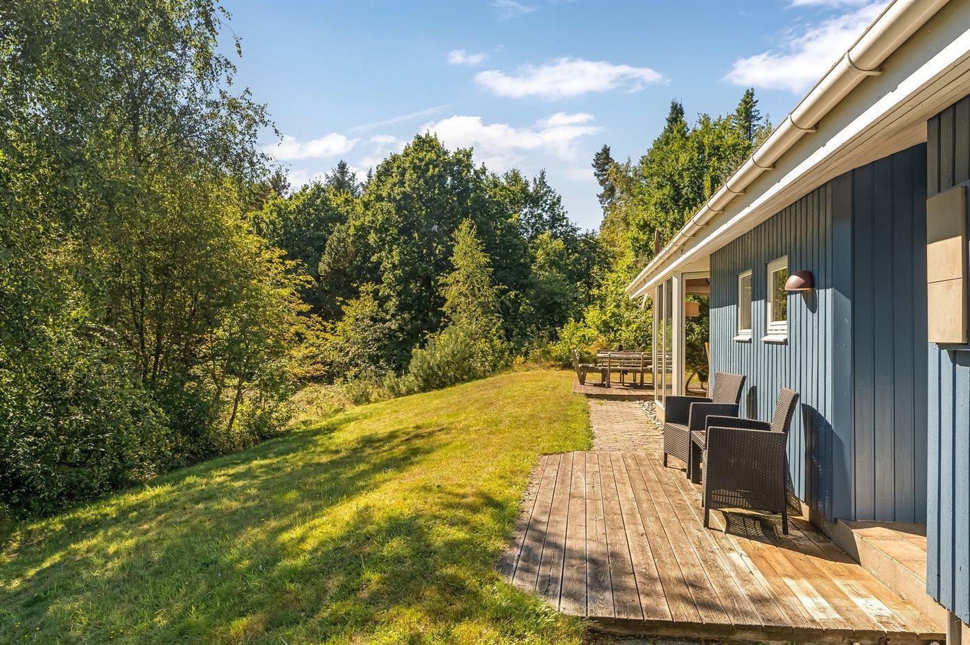 Die Ferienunterkunft liegt auf einem 2912 m² großen Gründstück, das in einem Wald/Plantage liegt. Die Entfernung zum Fjord beträgt 150 m. Es gibt einen Badesteg in der Nähe. Die nächste Einkaufsmöglichkeit liegt 5000 m entfernt. Es steht ein offenes Terrassenareal zur Verfügung. Außerdem gibt es überdachte Terrasse. Schaukel. Es steht ein Grill zur Verfügung. Parkplatz auf dem Grundstück.