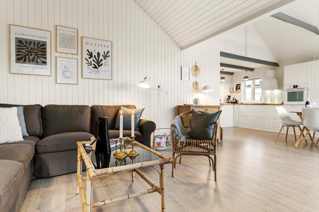 Die Atmosphäre im 89 m² großen Ferienhaus, das 2015 erbaut wurde, ist hell und freundlich. Das stilvolle Mobiliar passt perfekt zu den hellen Holzwänden und der bis unter den Giebel offenen Decke, während der Kaminofen die Gemütlichkeit unterstreicht. Im Wohnzimmer gibt es außerdem einen Flachbildfernseher, und der Raum ist offen mit einer hübschen, gut ausgestatteten Küche verbunden, in der mehrere Personen problemlos gemeinsam kochen können. Zur Raumaufteilung gehören auch ein schönes Duschbad und ein Eingangsbereich mit Waschturm sowie zwei gute Schlafzimmer mit insgesamt Schlafplätzen für vier Erwachsene und zwei Kinder.
