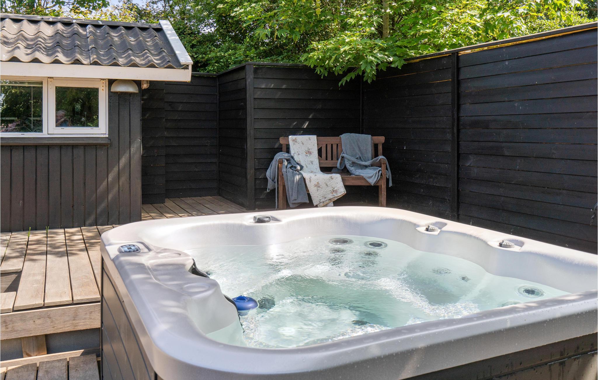 Das einladende Haus ist von einem schönen Garten umgeben. Hier finden Sie nicht nur Naturidylle, sondern auch einen schönen Outdoor-Spa, wo Sie sitzen und das Leben genießen können. Anschließend können Sie sich unter der Außendusche abwaschen und sich in die Sonne legen.