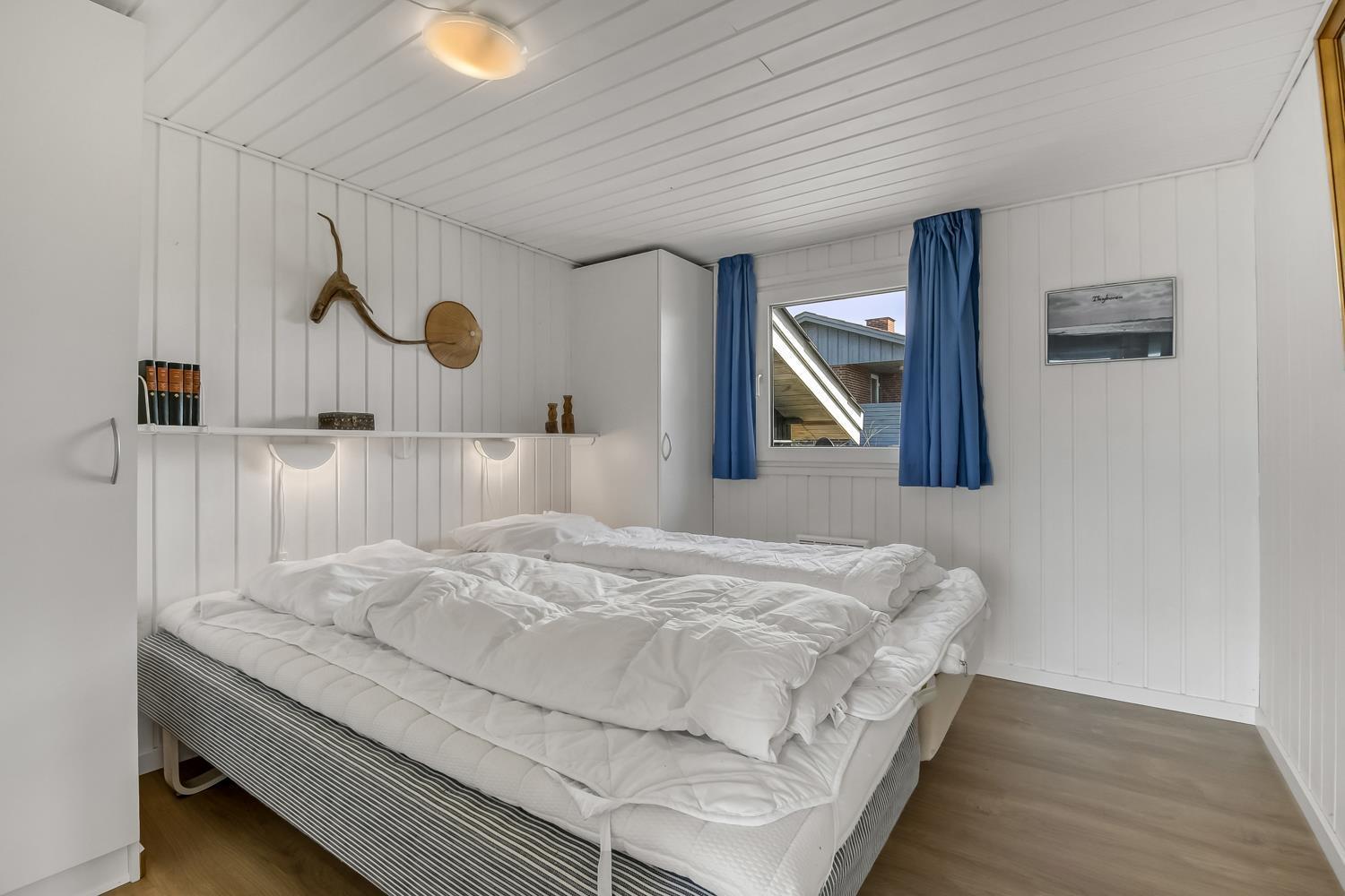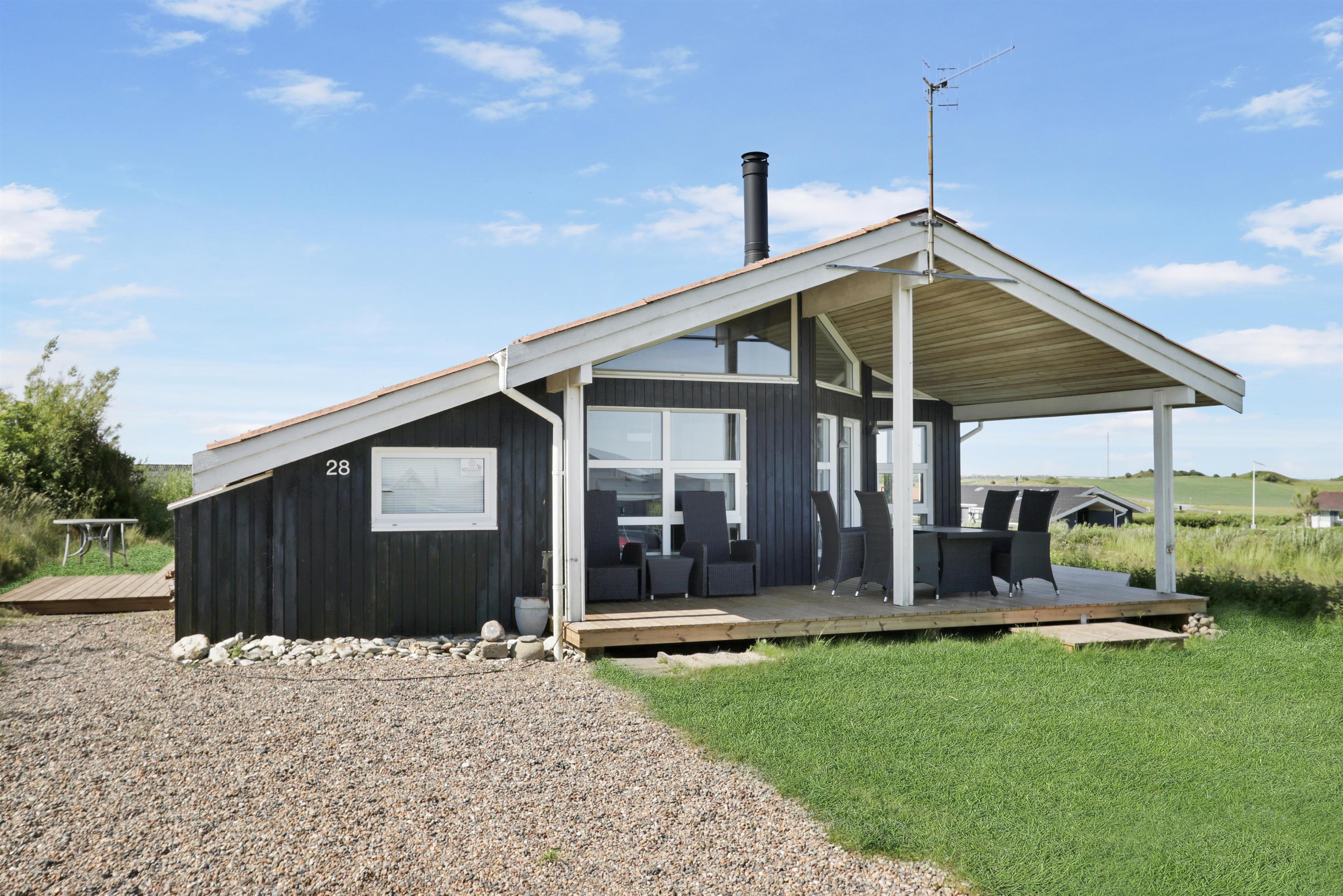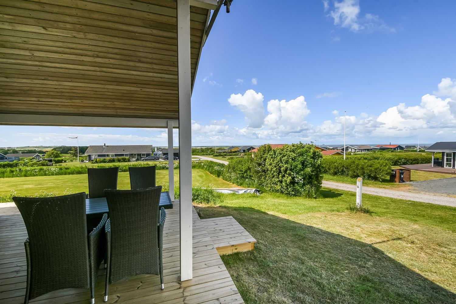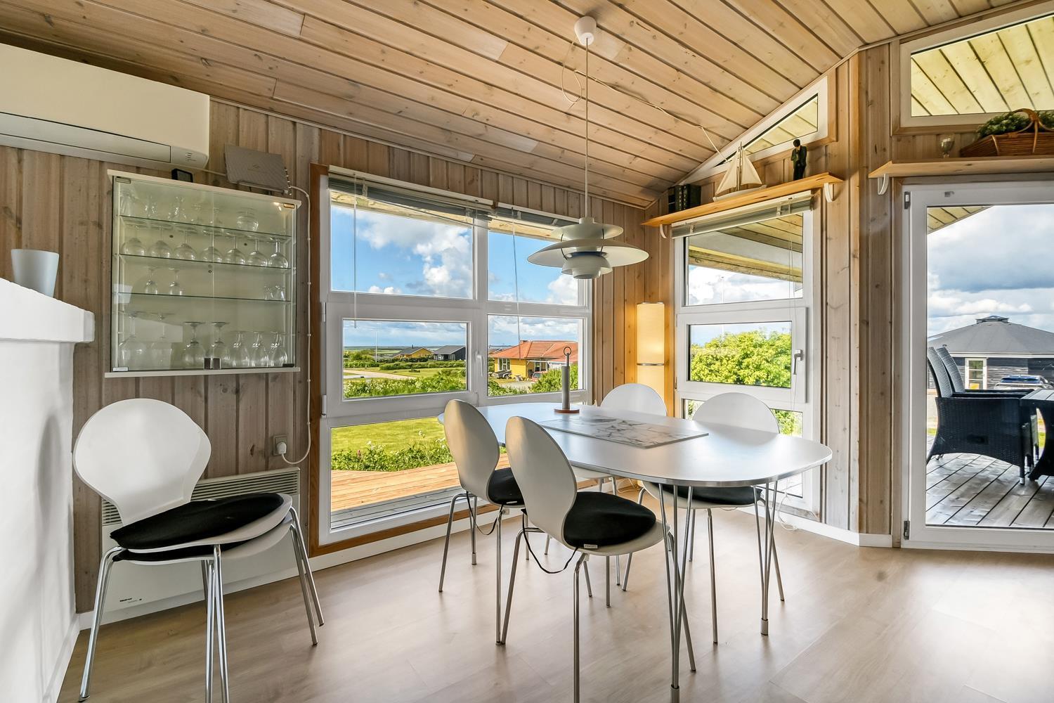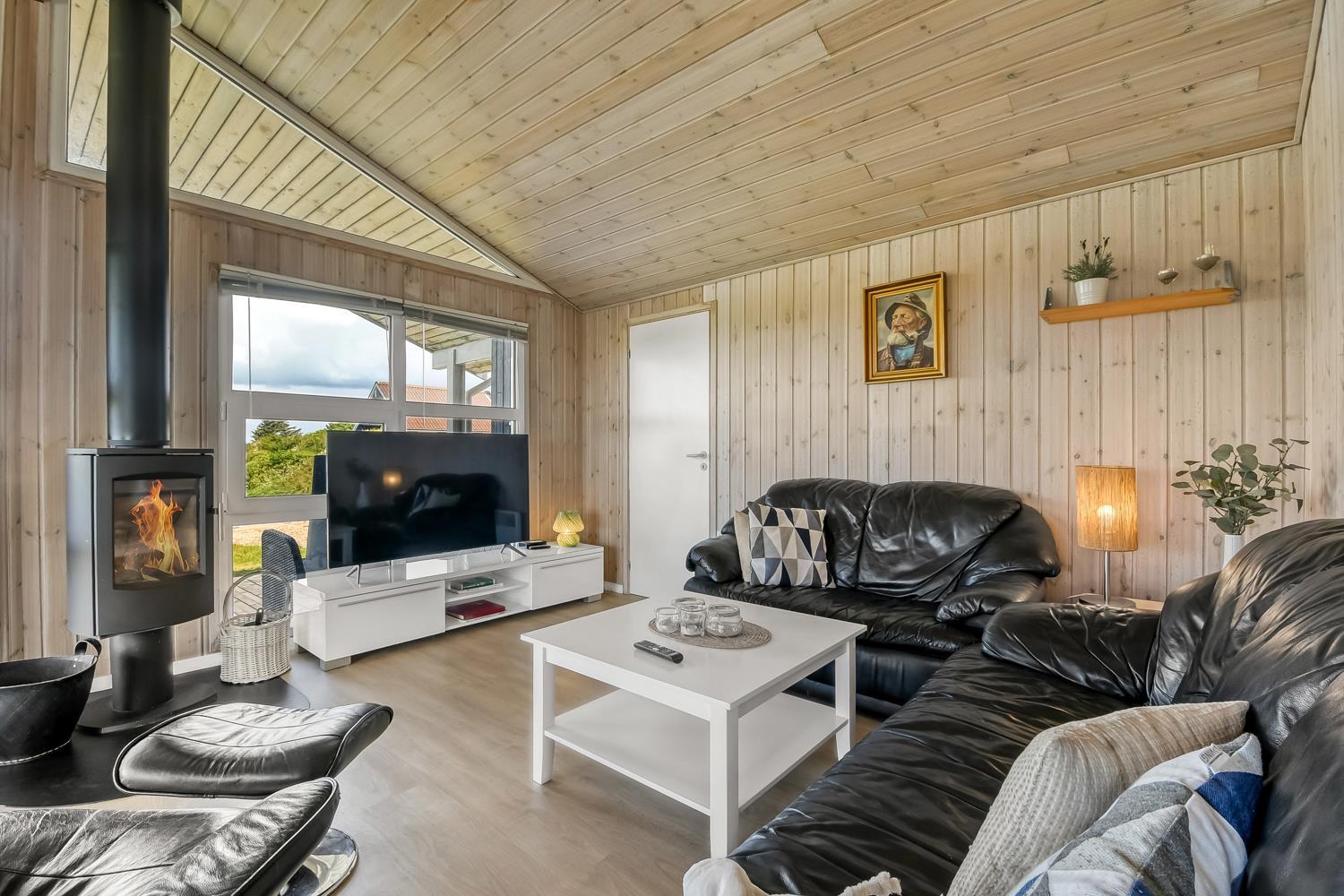 Holzferienhaus mit etwa 74 m2. Ein Flur heisst Sie willkommen. Der Wohnraum ist gemütlich eingerichtet mit Ledermöbeln, Esstisch, Radio und TV mit dänischen und deutschen Programmen und einem fantastischen Ausblick. Entspannen Sie sich vor dem Kaminofen, der zusammen mit der Wärmepumpe für eine schöne Wärme sorgt und die Nebenkosten niedriger hält. 3 Schlafräume: 1DB + 1DB + 2B. Küche mit E-Herd mit Cerankochfeld, Abzugshaube, Geschirrspüler, Kühlschrank mit kleinem Gefrierfach. Schönes Badezimmer mit Toilette, Waschbecken, Dusche und Fliesenboden mit Fussbodenheizung. Rauchen ist nicht erlaubt. Max. 1 Haustier ist erlaubt. Es ist ein sehr schönes Ferienhaus mit einem schönen Ausblick.