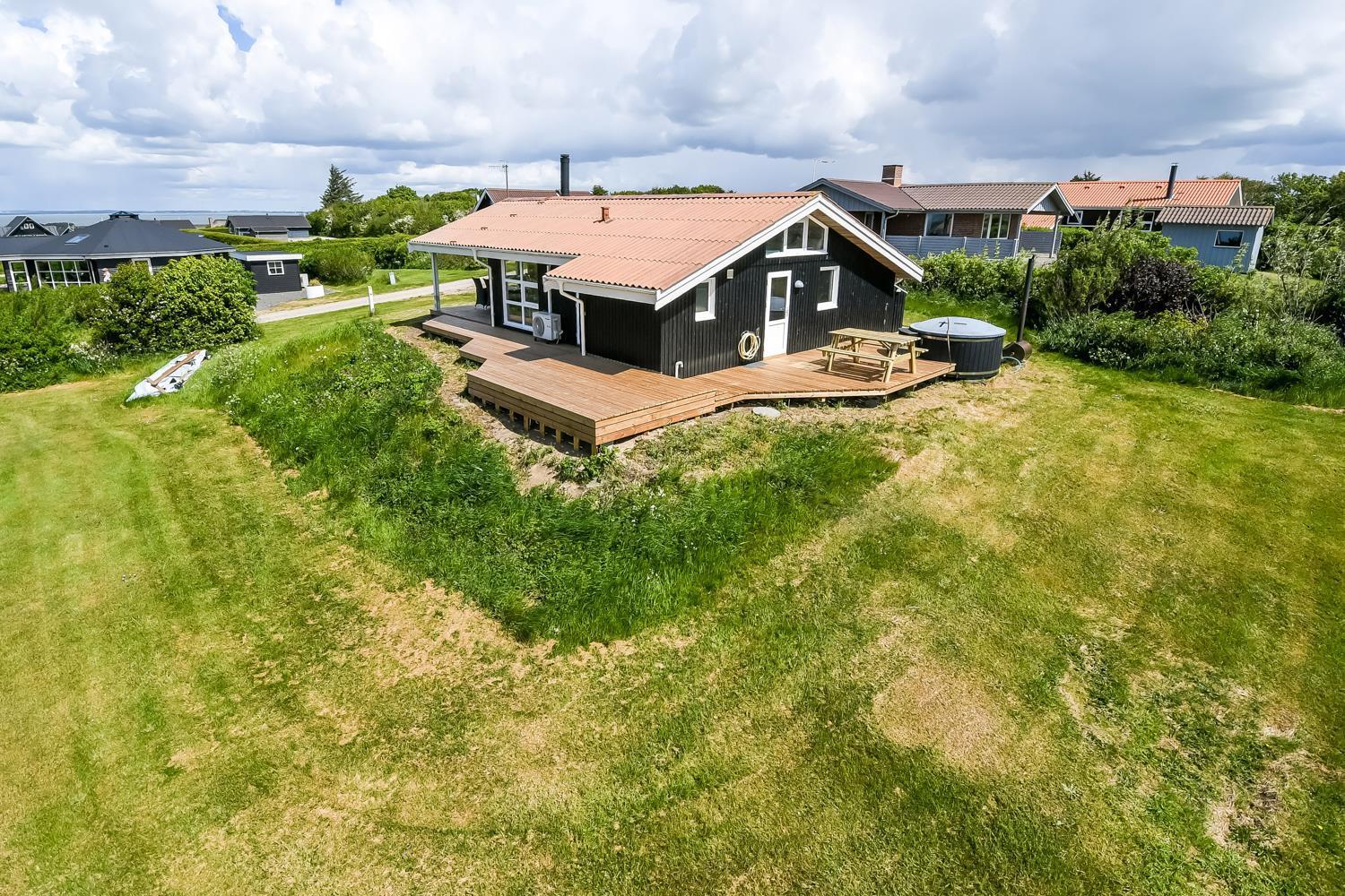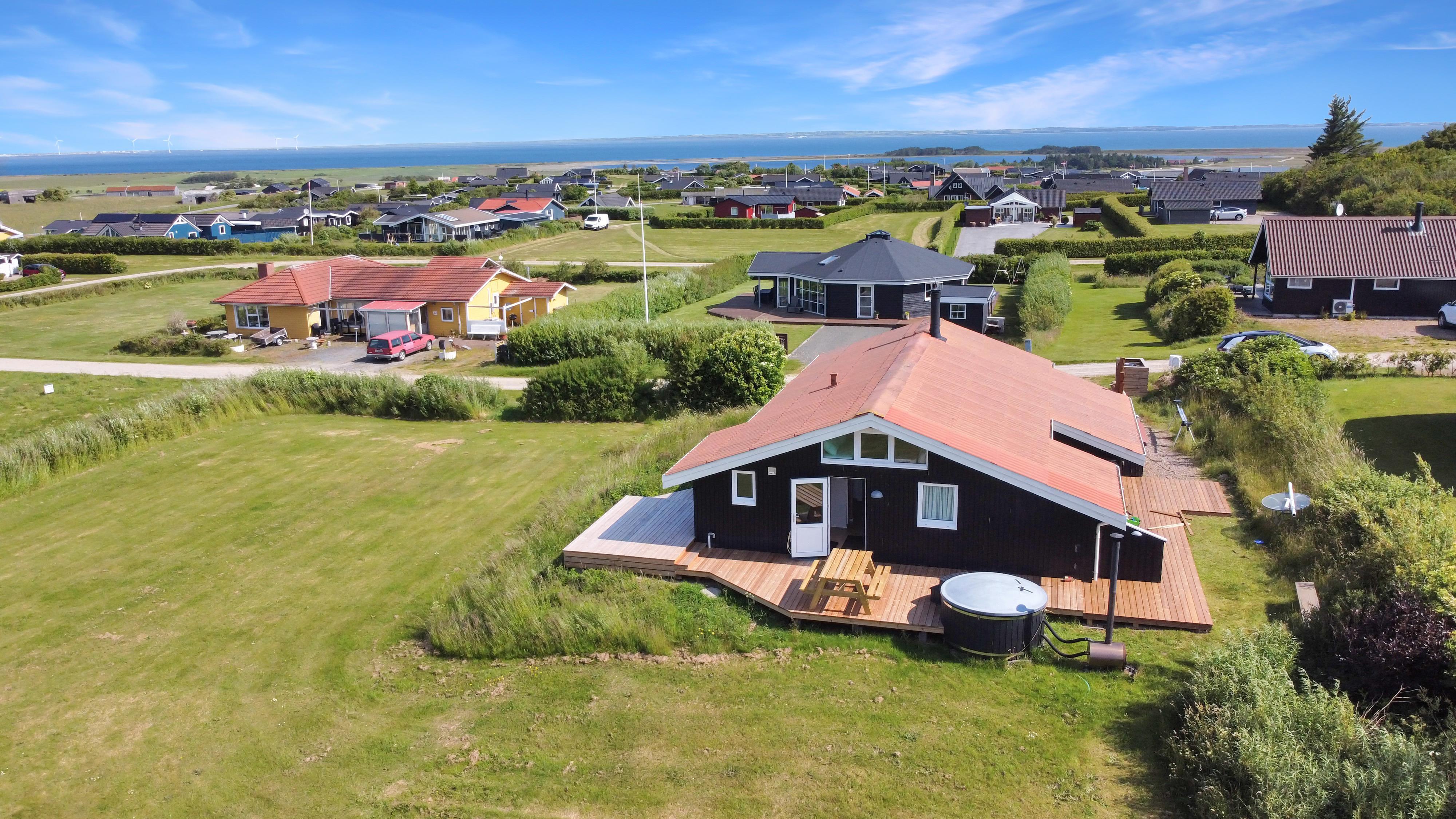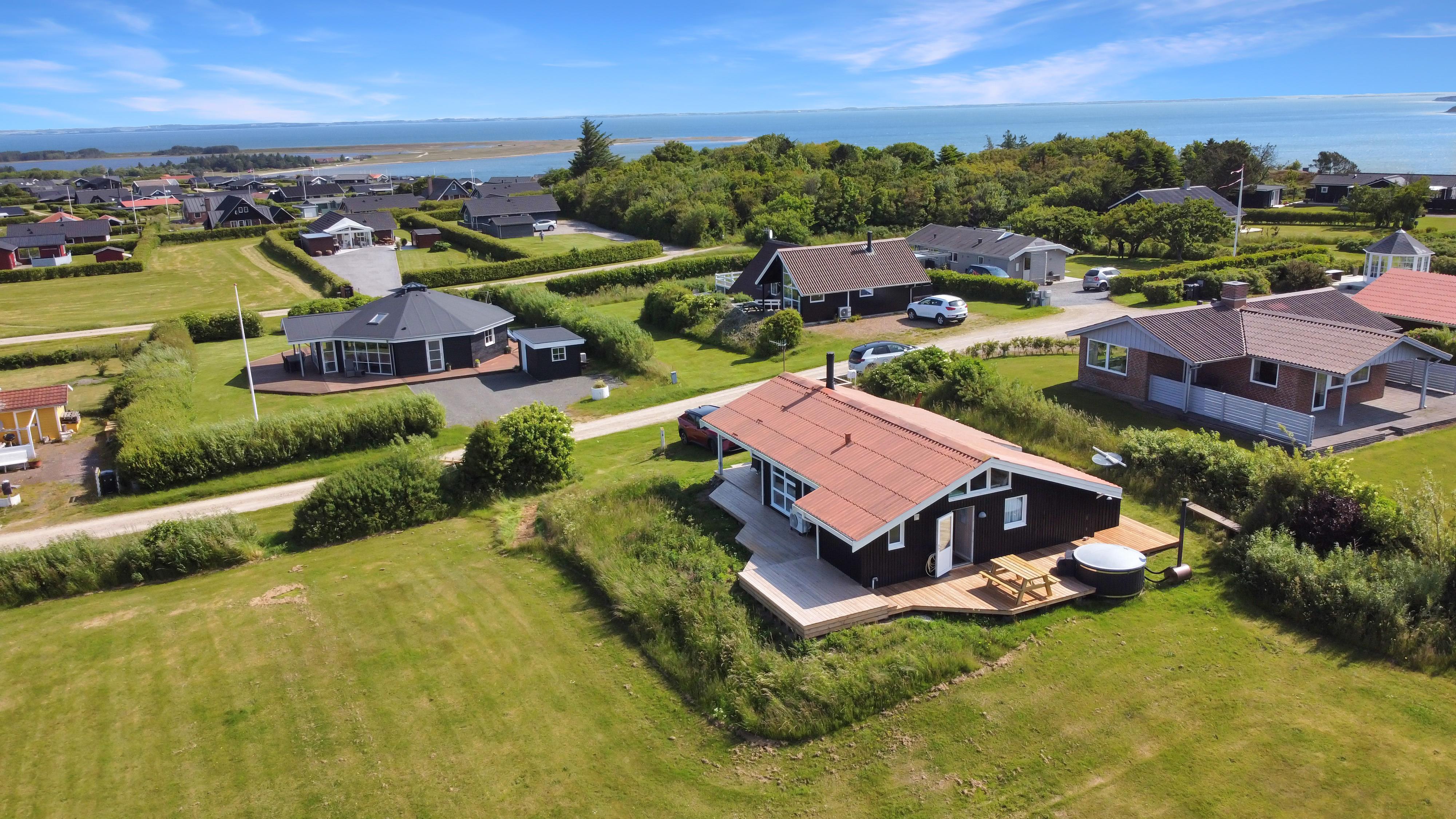 Neue Terrasse mitte Mai fertig. Schönes, modernisiertes Ferienhaus mit freiem WLAN, Aussen-Whirlpool in der Natur und einer ganz einzigartigen Lage. Fantastischer Blick über den Limfjord, Gjellerodde – bis Thyborøn und Agger mit der Nordsee im Horizont. Das Haus ist ideal für 2 Erwachsene oder die Familie die etwas ganz besonderes möchten und die in einer kinderfreundlichen Gegend mit vielen Möglichkeiten wohnen möchten.