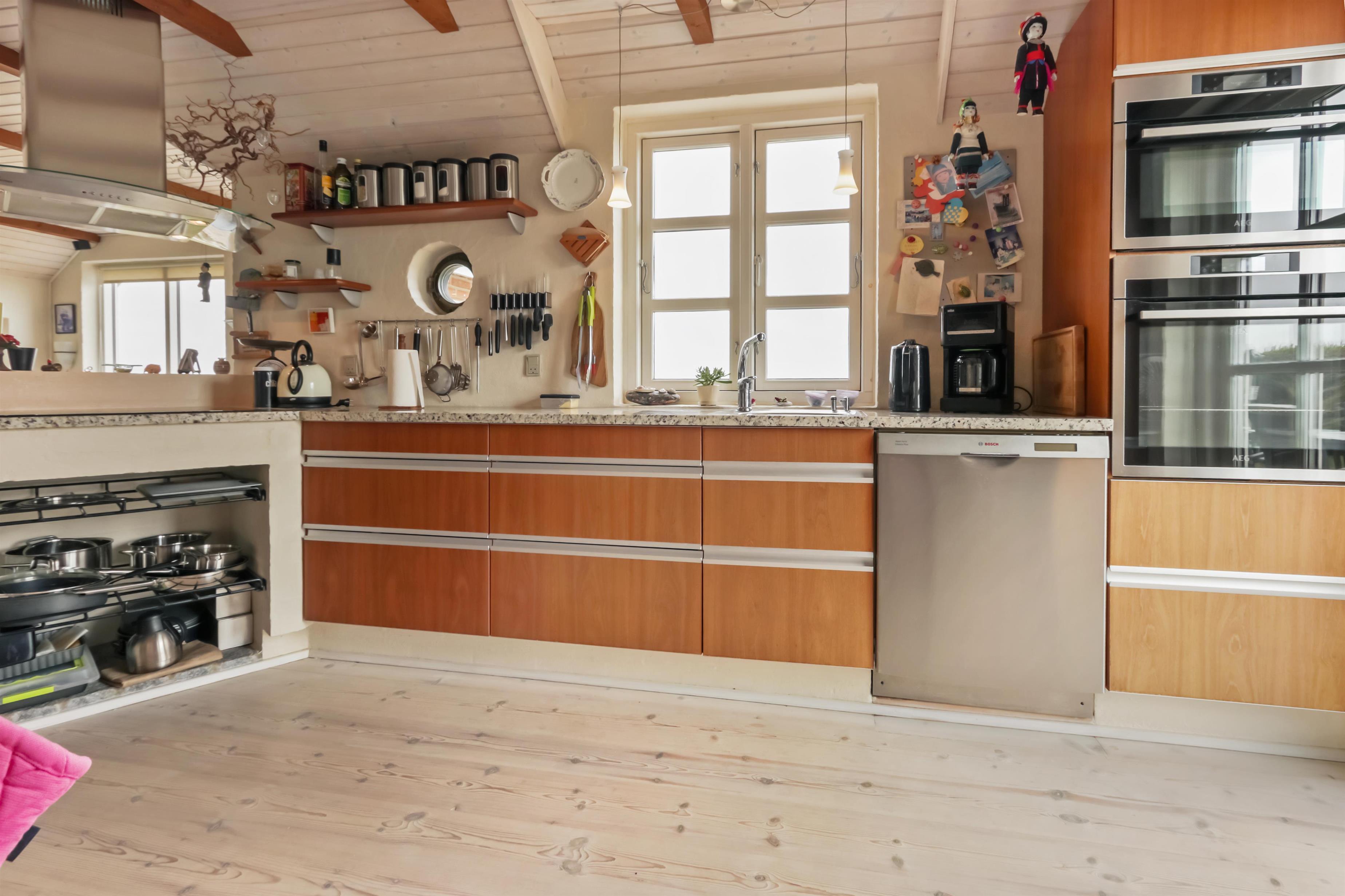 Das Ferienhaus ist 87 m² groß. Kombinierter Wohnbereich und Küchenzeile mit Zugang zur Terrasse. Gut ausgestattete Küchenzeile mit allem, was man an Geschirr und Küchenutensilien braucht, sowie Induktionskochfeld, Dunstabzugshaube, eingebauter Kombiofen, Geschirrspüler und Kühlschrank mit Gefrierfach. Schöner Wohnbereich mit Ledermöbeln, Esstisch, Fernseher mit dänischen Sendern sowie Chromecast, das das Streamen eigener Radio- und TV-Programme ermöglicht. Ein gemütlicher Holzofen sorgt für zusätzliche Behaglichkeit, und zusammen mit der Wärmepumpe werden die Verbrauchskosten zu jeder Jahreszeit gering gehalten.
