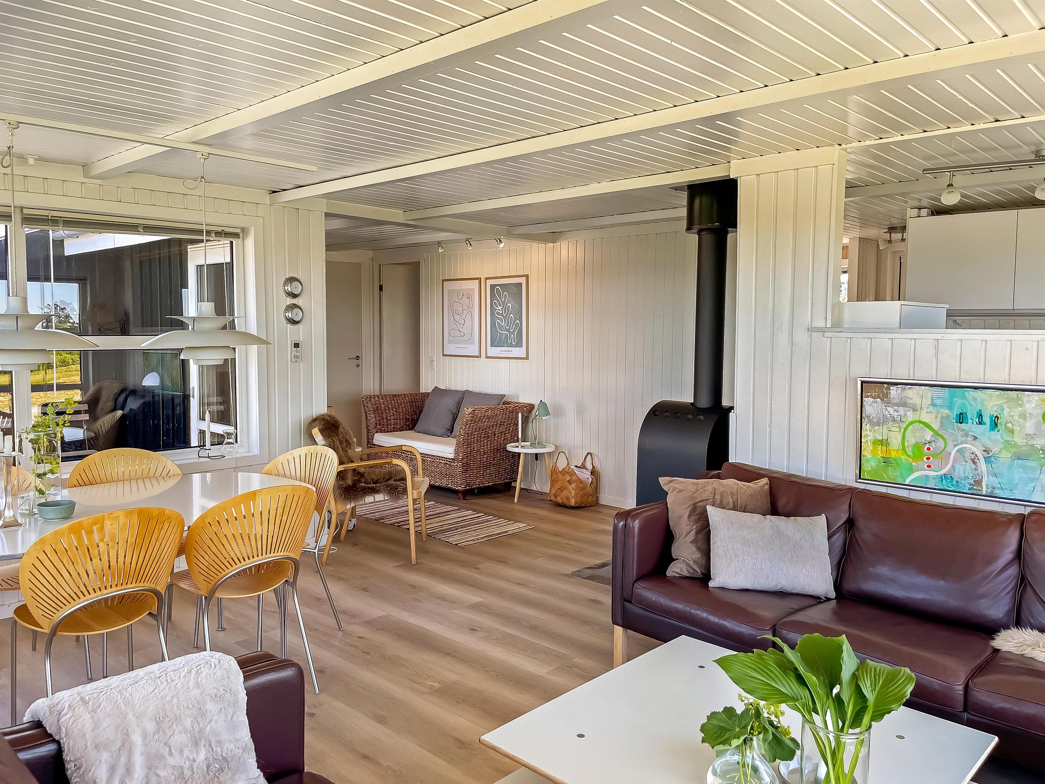 Das Wohnzimmer ist kombiniert mit der Kochnische und ist ansprechend mit bequemen Ledermöbeln eingerichtet. Es gibt einen Fernseher mit dänischen und deutschen Programmen sowie Chromecast, sodass Sie TV, Radio und Apps über Ihre eigenen Geräte streamen können. Genießen Sie den knisternden Kamin, der zusammen mit der Wärmepumpe hilft, die Heizkosten zu reduzieren, und gleichzeitig den herrlichen Blick auf den Limfjord.