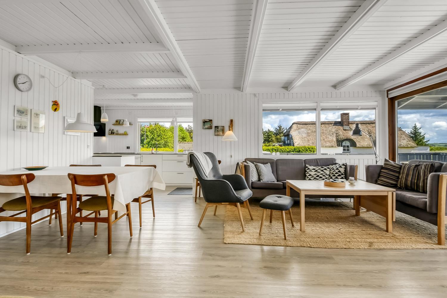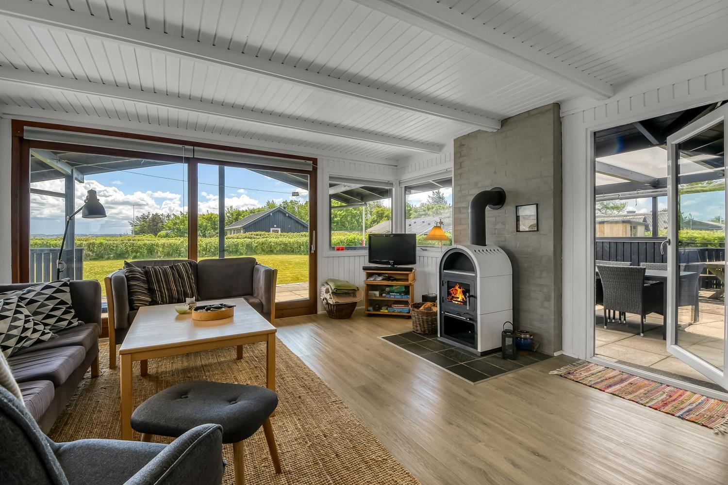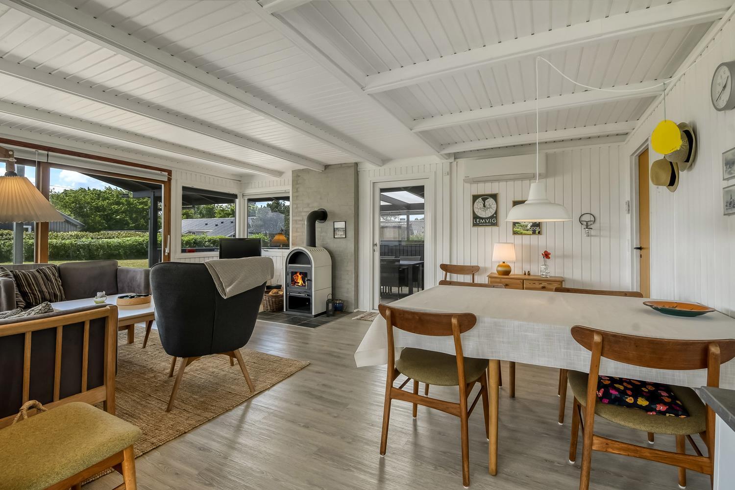 Das helle, kombinierte Wohn- und Esszimmer ist mit Polstermöbeln, einem Kaminofen für wohlige Wärme sowie einem Glasfaser-TV mit dänischen und deutschen Sendern ausgestattet – ideal zum Entspannen nach einem Tag in der Natur.