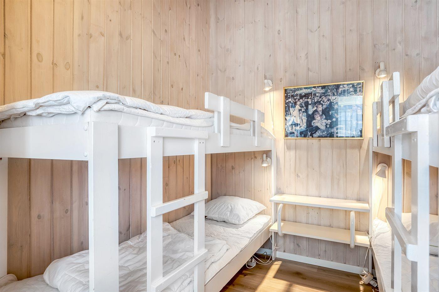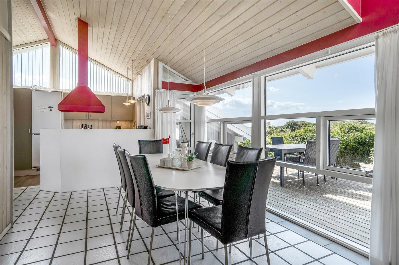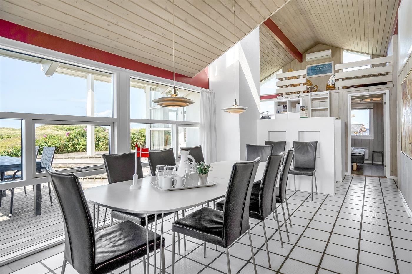Dieses schöne Ferienhaus ist in versetzten Ebenen gebaut und im Wohnzimmer gibt es ein großes offenes Obergeschoss, wo die Kinder spielen können, während die Erwachsenen es sich im Wohnzimmer oder in der Küche gemütlich machen. Das Haus hat eine ganz einmalige Lage in der ersten Dünenreihe und am Ende einer Sackgasse, auf einem sehr großen und leicht hügeligen Dünengrundstück. Von hier aus führt ein Pfad direkt an den schönen Strand der Nordsee und sowohl vom Haus als auch vom Grundstück aus hat man einen herrlichen Blick auf die Nordsee und die faszinierende Dünenlandschaft. Vom höchsten Punkt der Dünen aus gibt es außerdem einen 180-Grad-Blick über die Bucht ”Jammerbugten”.