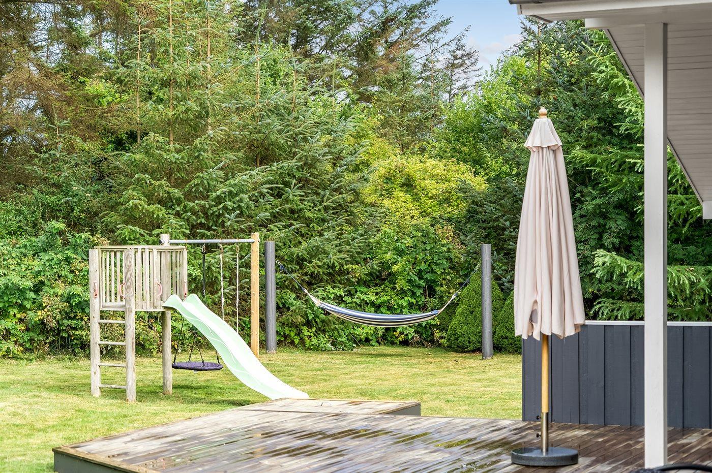 Sehr hübsches und gut eingerichtetes Luxusferienhaus aus Holz, 2007 mit u. a. Whirlpool und Sauna gebaut. Das Haus liegt auf einem großen Naturgrundstück - nur 700 m vom breiten Sandstrand bei Grønhøj entfernt. Zum Haus gehören gutes sowohl offenes als auch überdachtes Terrassenareal mit Gartenmöbeln. Innen gibt es überall helle Holzwände und -decken sowie Holzböden, jedoch beheizten Klinkerboden im Badezimmer und in der Gästetoilette. Das Badezimmer ist mit Duschnische, Fußbodenheizung, 2-Pers.-Whirlpool und Sauna sowie Waschmaschine eingerichtet. Hübsche, moderne Küche mit Geschirrspüler, Mikrowelle, Warmluftofen, Herd mit Ceran-Feld und Tiefkühlgerät. Schönes Wohnzimmer mit Kaminofen, TV mit digitalem Satellitenanschluss, DVD-Spieler und CD-Spieler sowie Zutritt zur Terrasse. Die Schlafplätze des Hauses verteilen sich auf 3 Schlafzimmer: 2 mit Doppelbett und 1 mit 2 Einzelbetten. Ferner Alkoven mit 2 Schlafplätzen im Wohnzimmer. Kinderbett, Kinderhochstuhl, Sandkiste und Schaukel für die Kinder. Carport auf dem Grundstück. Wärmepumpe zur Verfügung. Ein sehr schönes und gut eingerichtetes Ferienhaus, das sowohl für 1 als auch 2 Familien geeignet ist.