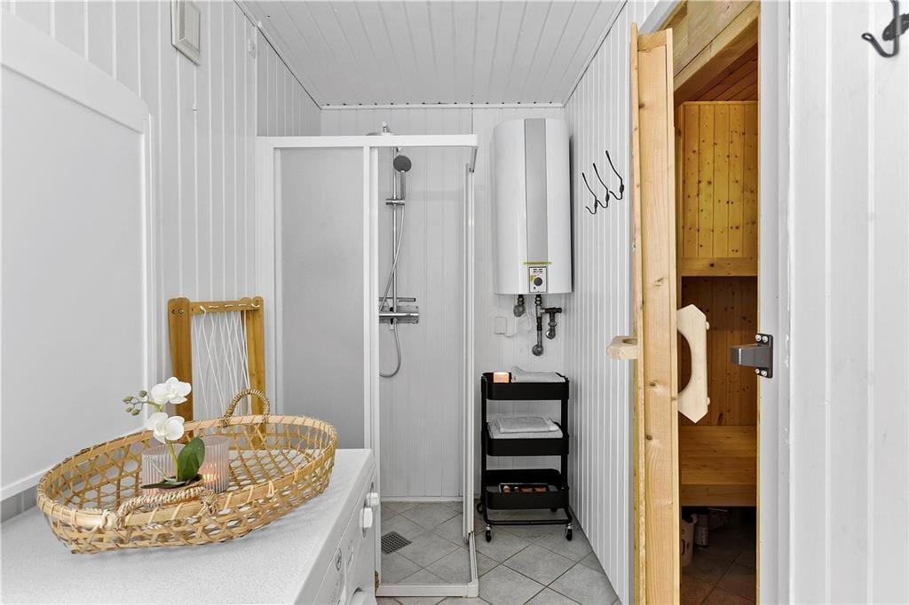 Weiße Holzleisten an den Wänden, schönes Mobiliar und gemütliche Details tragen gemeinsam zum guten und stimmungsvollen Gesamteindruck des Hauses bei. Das Wohnzimmer ist ein gemütlicher Aufenthaltsraum mit Kaminofen, einer Sofaecke mit Flachbildschirm und einem Esstisch nahe der offenen Küche, und die vielen Fenster im Raum sorgen für viel Tageslicht. In den drei Schlafzimmern gibt es Platz für bis zu fünf Übernachtungsgäste in den komfortablen Betten – und da es Ferienzeit ist, können Sie sicher auf den Wecker verzichten und einfach lange ausschlafen. Wenn es wirklich Zeit zum Entspannen ist, fühlt es sich wie eine wunderbare Art der Selbstverwöhnung an, sich in der Sauna des Badezimmers richtig durchwärmen zu lassen.