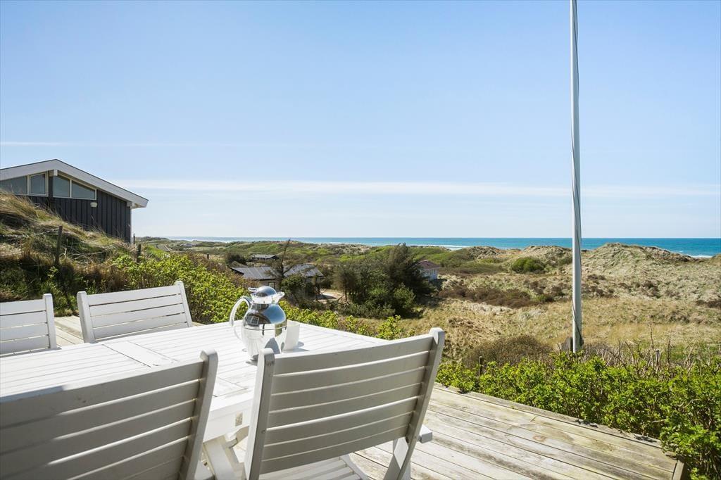 Vom Wohnzimmer tretet ihr hinaus auf die neue, große Holzterrasse mit Essplatz, Sonnenliegen und Hot Tub – eines der absoluten Highlights des Hauses. Hier vereinen sich Sonne, Meeresluft und der großartige Blick über die Dünen zu einer ganz besonderen Urlaubsstimmung. Wenn der Tag sich dem Ende neigt, könnt ihr den Sonnenuntergang direkt von der Terrasse oder dem Hot Tub aus erleben, während der windgeschützte Sonnenhof nach Süden und Osten morgens und mittags Sonne sowie Ruhe für ein gemütliches Mittagessen in der Wärme bietet. Hinweis: Die Terrasse wurde im Herbst 2025 angelegt – neue Fotos folgen im Frühjahr 2026. Vor dem Haus erstreckt sich eine geschützte Dünenlandschaft bis hinunter zum Strand, und oft kommen Rehe vorbei. Die Lage ist ruhig, ungestört und absolut einzigartig – nur 150 Meter von einem der schönsten Strände Dänemarks entfernt.