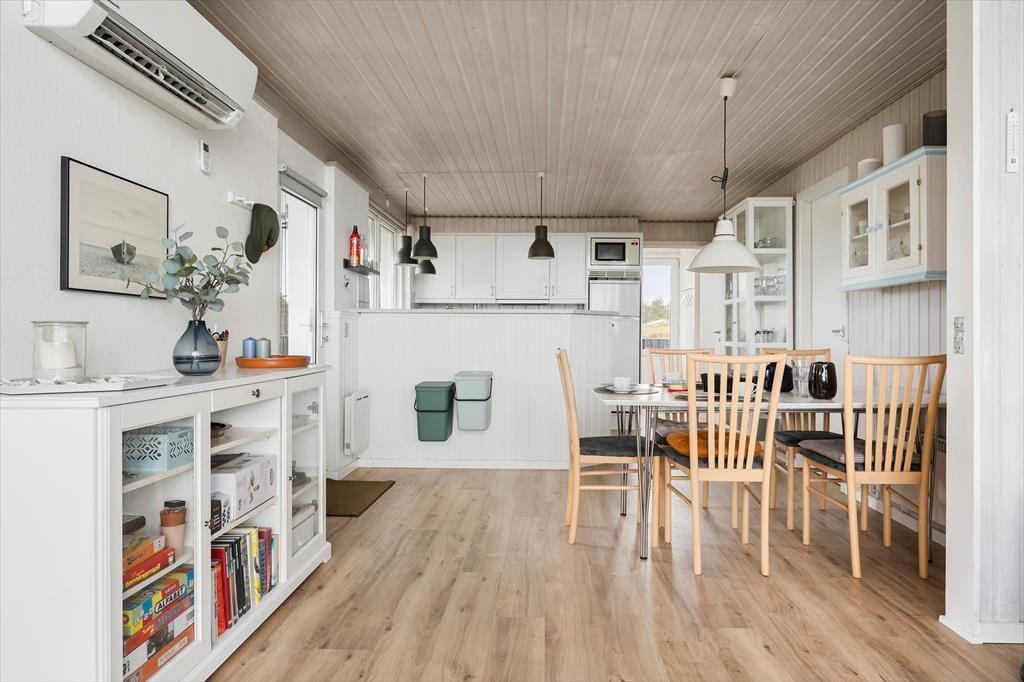 Sie können problemlos bis zu sechs Personen in dem Haus unterbringen und haben trotzdem das Gefühl, viel Platz um sich herum zu haben. Der Grundriss bietet vier Schlafzimmer, ein Loft und zwei Bäder, wobei das größte Bad nicht nur mit einer Dusche, sondern auch mit einem Whirlpool und einer Sauna ausgestattet ist. Auch der Wohnbereich ist wunderbar geräumig: Hier ist die Küche offen zu einem schönen Wohnzimmer mit Esstisch, Sofa und Holzofen, und eine Treppe führt hinauf zu einem weiteren Wohnbereich mit einer Sofalandschaft. Von dem erhöhten Wohnzimmer aus können Sie den Blick auf das Meer genießen. Von den anderen Zimmern aus können Sie auf die mit Algen bewachsenen Dünen und Hagebuttensträucher blicken, ein herrlicher Anblick, der das Urlaubsgefühl noch verstärkt.