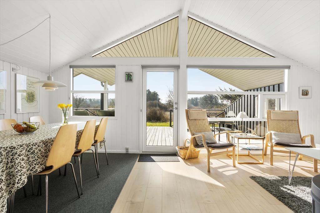Das Ferienhaus ist gemütlich eingerichtet, mit dem Fokus auf Entspannung und gemeinsamer Zeit. Der offene Grundriss schafft eine angenehme Atmosphäre, in der Küche und Wohnzimmer ein gemeinsames Aufenthaltszimmer bilden. Hier kannst du die Aussicht auf die grünen Umgebung durch die großen Fenster genießen, während du an kühlen Abenden vor dem Kaminofen entspannst. Das Ferienhaus bietet Platz für sechs Personen, sodass sowohl Familie als auch Freunde gemeinsam unvergessliche Urlaubserinnerungen schaffen können. Wenn die Sonne hoch am Himmel steht, bietet es sich an, auf die große, nach Süden ausgerichtete Holzterrasse zu treten, die teilweise überdacht ist. Hier kannst du eine Tasse Kaffee im Morgen-Sonnenlicht genießen oder das Abendessen grillen, während die Vögel im Garten zwitschern.