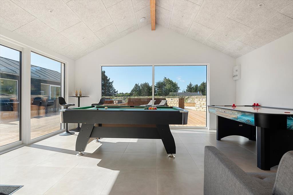 Im Inneren ist alles auf ein gelungenes Urlaubserlebnis ausgerichtet. Das Ferienhaus strahlt Qualität und modernen Komfort aus und ist perfekt auf Urlaube mit vielen Personen zugeschnitten – sei es die ganze Familie, mehrere befreundete Paare oder sogar drei Generationen. Die hellen Räume laden zum Beisammensein ein, und der offene Wohnbereich schafft den perfekten Rahmen für Kochen, Spielen oder gemütliche Abende. Die gut ausgestattete Küche ist offen mit dem Wohnzimmer verbunden, sodass du beim Kochen trotzdem am Geschehen teilhaben oder den Kindern beim Spielen zusehen kannst. Wenn ihr richtig abschalten wollt, könnt ihr eine Runde in der Sauna oder im Whirlpool auf der Terrasse genießen. Für die Energiegeladenen bietet der Aktivitätsraum mit Billardtisch und Airhockey eine tolle Gelegenheit, sich auf unterhaltsame und ungezwungene Weise – unabhängig vom Alter – zu messen.