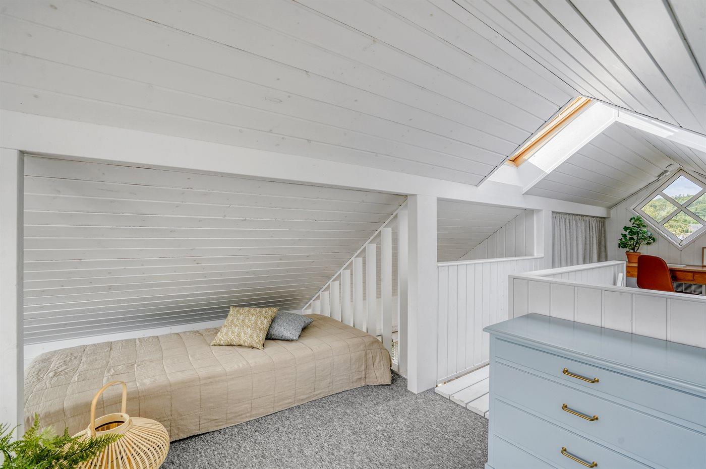 Von dem gemütlichen und einladenden Obergeschoss aus hast du einen schönen Meerblick. Hier können vier Personen schlafen – die Schlafplätze verteilen sich auf zwei alkovenartige Schlafbereiche mit guten Matratzen auf Rädern, die sich ganz nach Bedarf leicht umstellen lassen.