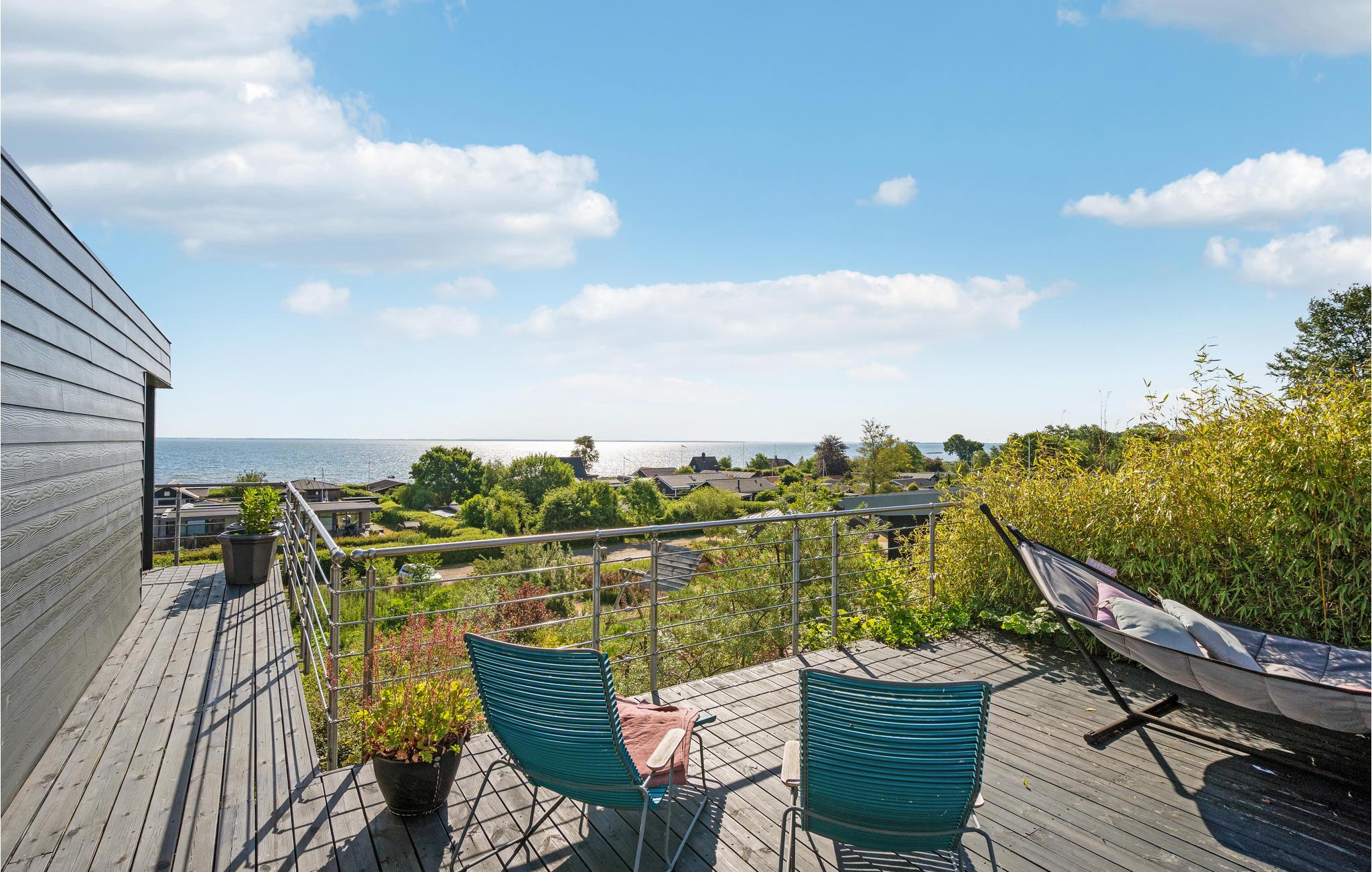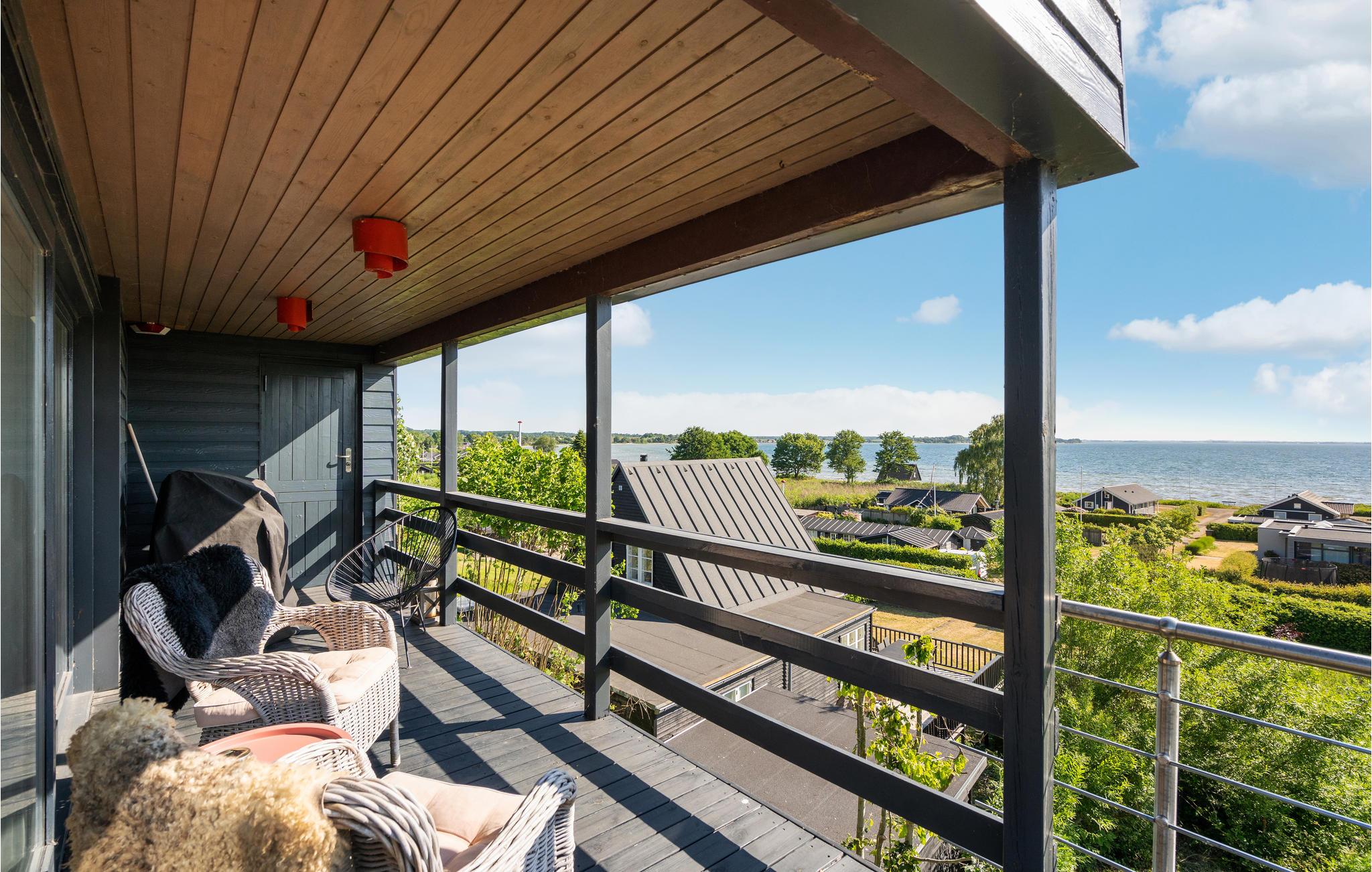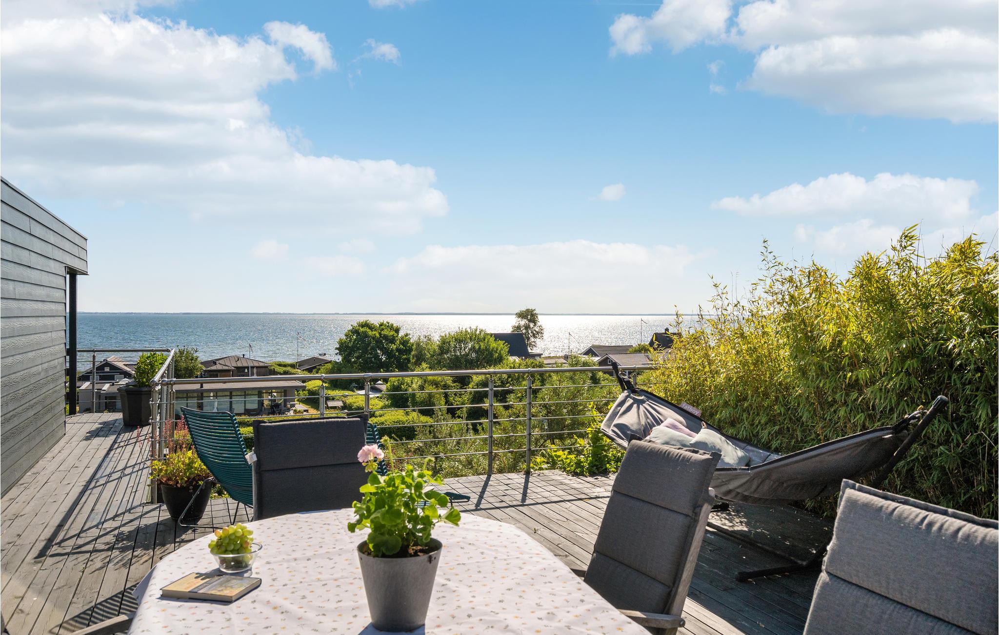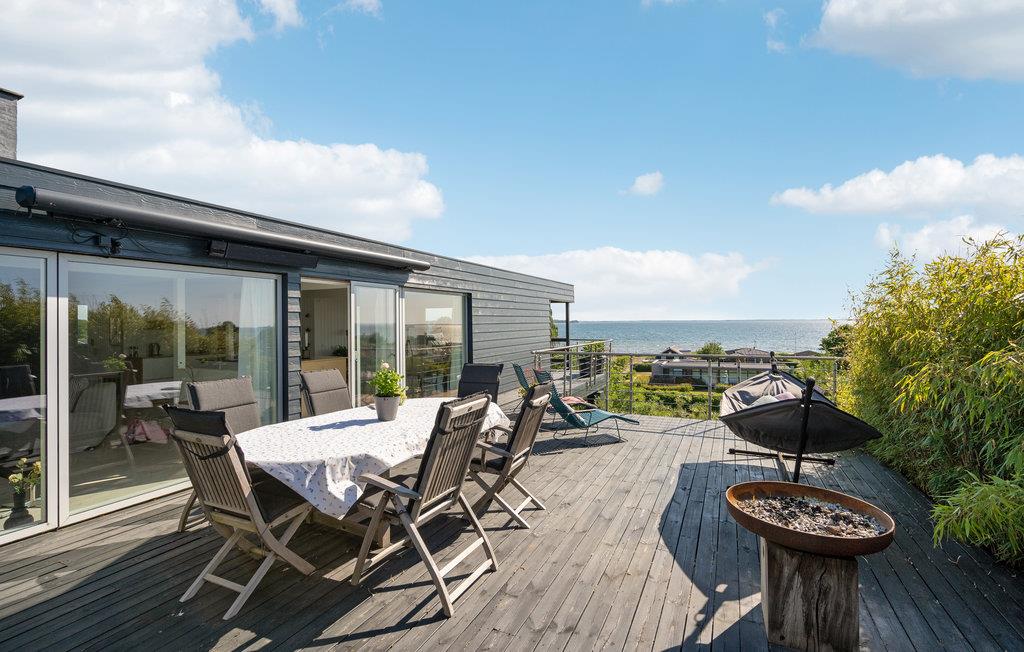 Modernes Ferienhaus mit Panoramablick, großer Terrasse und kinderfreundlichem Strand in Sjølund, Dänemark.
