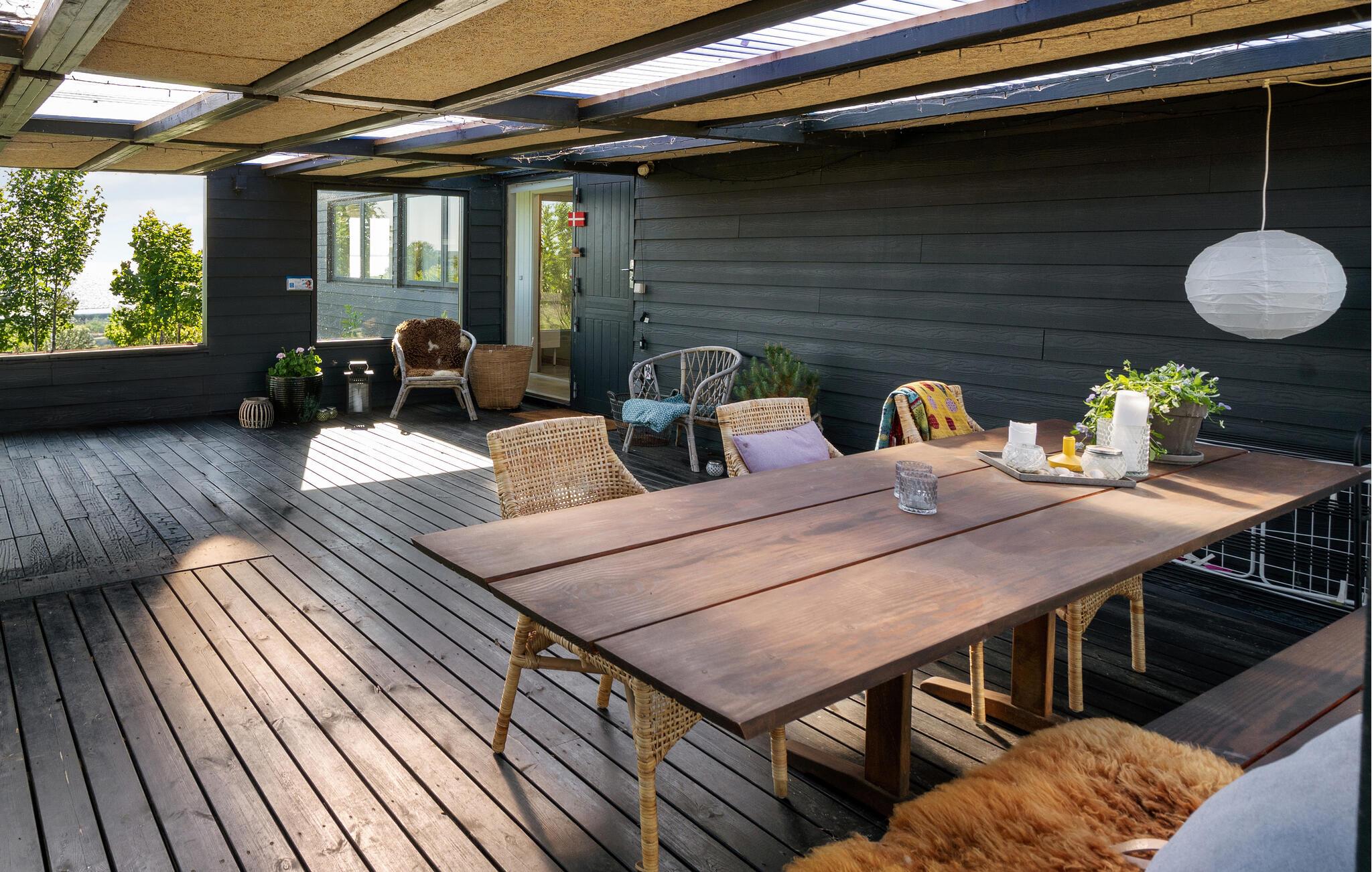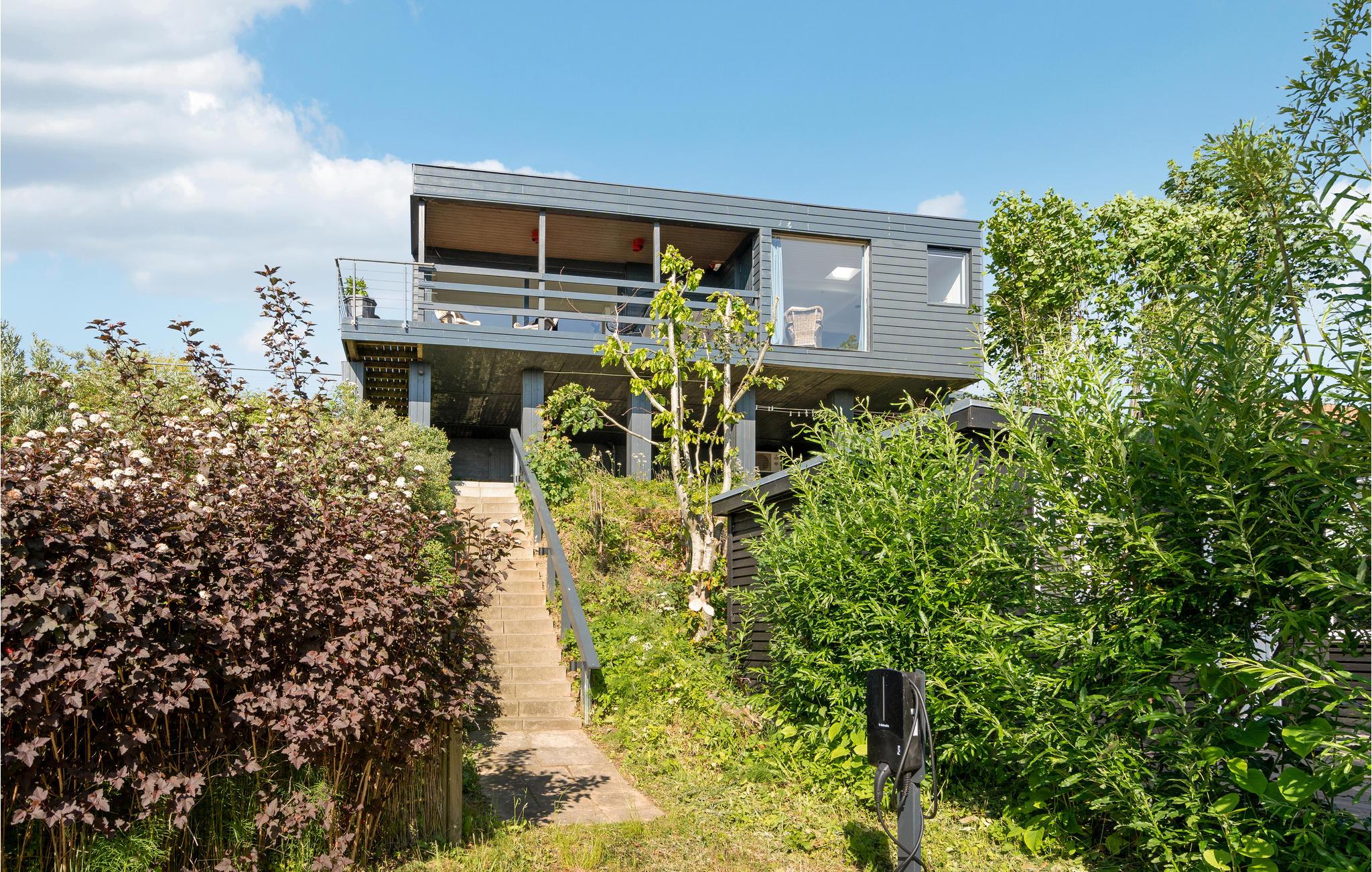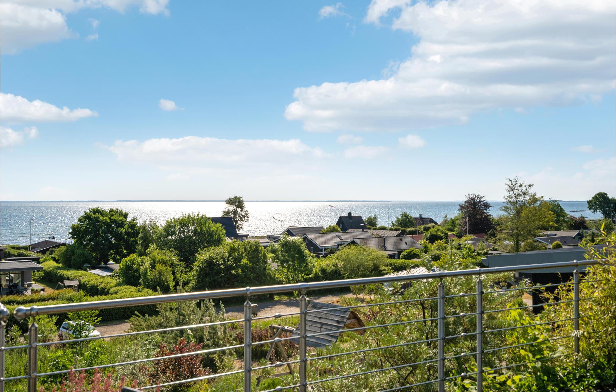 Modernes Ferienhaus mit Panoramablick, großer Terrasse und kinderfreundlichem Strand in Sjølund, Dänemark.