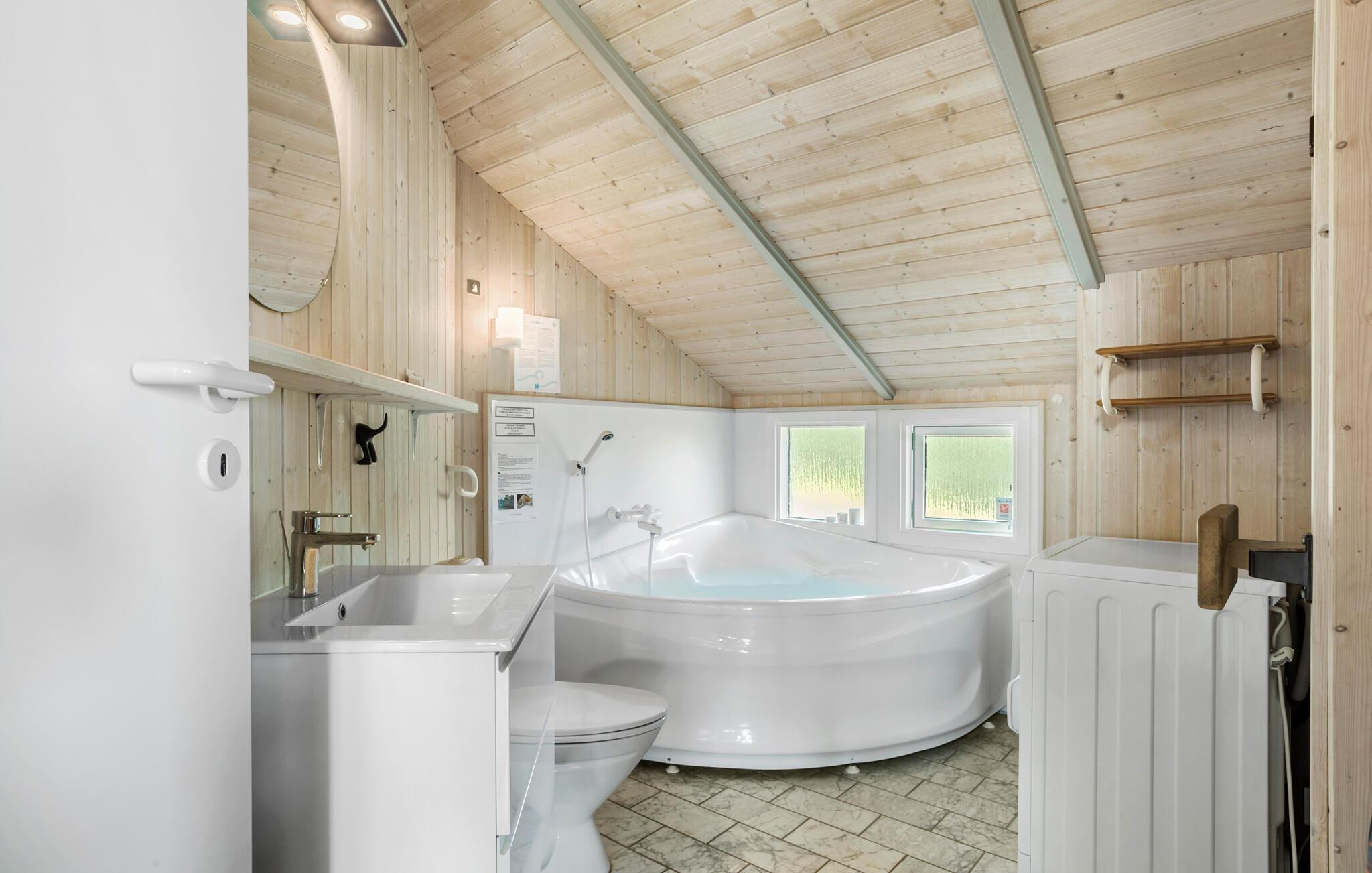 Erleben Sie einen erholsamen Urlaub in diesem exquisiten Ferienhaus am Grønninghoved Strand. Die lichtdurchfluteten Innenräume, die durch zahlreiche Fenster und große Dachfenster strahlen, bieten Ihnen eine helle und freundliche Atmosphäre. Die geschmackvolle Einrichtung, kombiniert mit dem gemütlichen Holzofen im Wohnzimmer, sorgt für behagliche Abende. Gönnen Sie sich Wellnesszeit im Badezimmer, wo Sie mit Whirlpool-Eckbadewanne und Sauna Ihren Alltagsstress hinter sich lassen können.