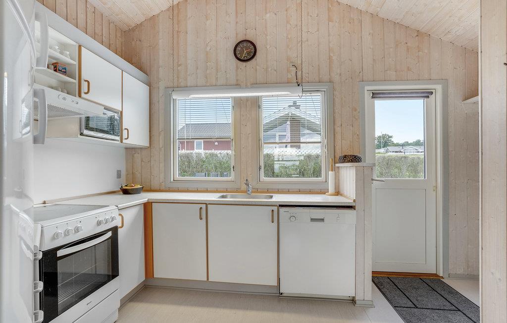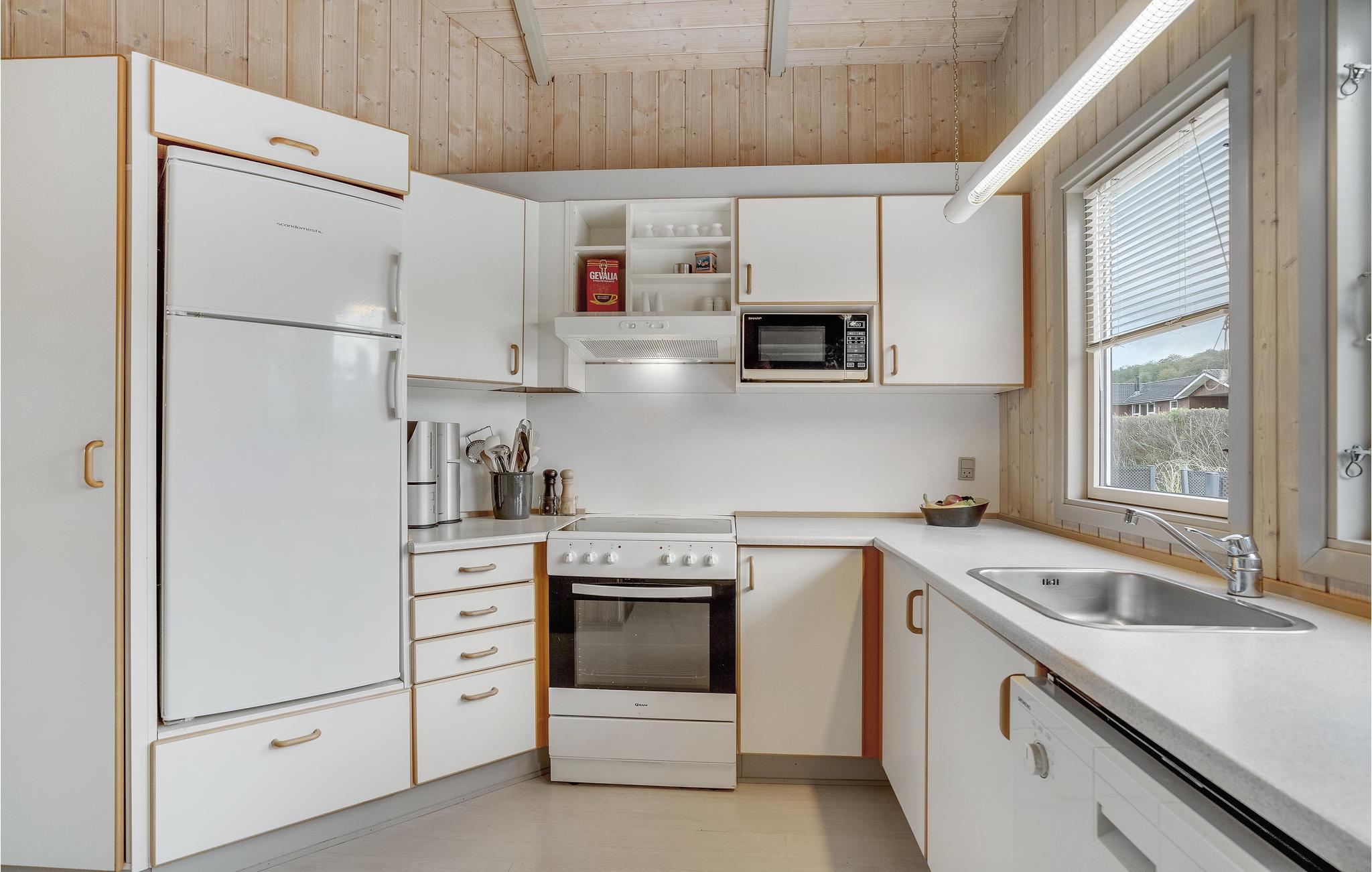 Eine lichtdurchflutete Wohnküche mit guter Einrichtung und offenem Dachfirst. Im Haus gibt es drei Schlafzimmer, ein Badezimmer mit Whirlpool und Sauna.