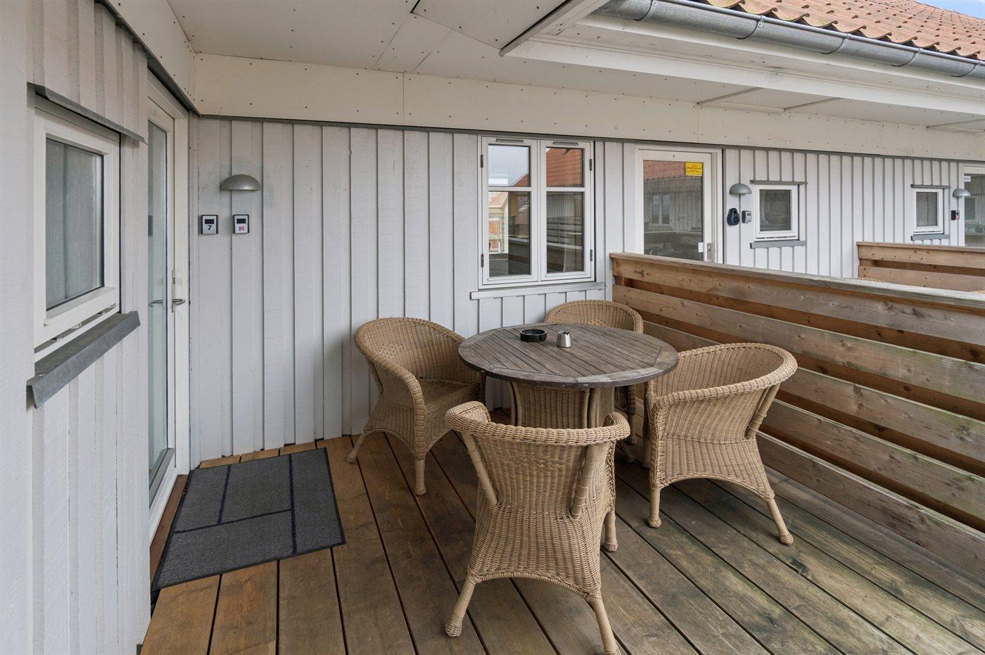 Die Gudhjem Købmandsgård besteht aus mehreren Ferienwohnungen im ersten Stock, die eine schöne Holzterrasse mit kleinen privaten Bereichen für jede Wohnung umgeben. Der Zugang erfolgt über eine gemeinsame Treppe, die zum Terrassenbereich führt.