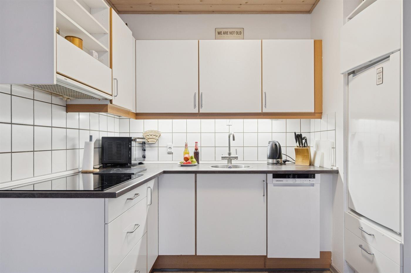 Die Küche ist mit Kühlschrank ausgestattet. Außerdem gibt es 4 Keramik-Kochfelder, Minibackofen, Mikrowelle sowie Geschirrspüler.