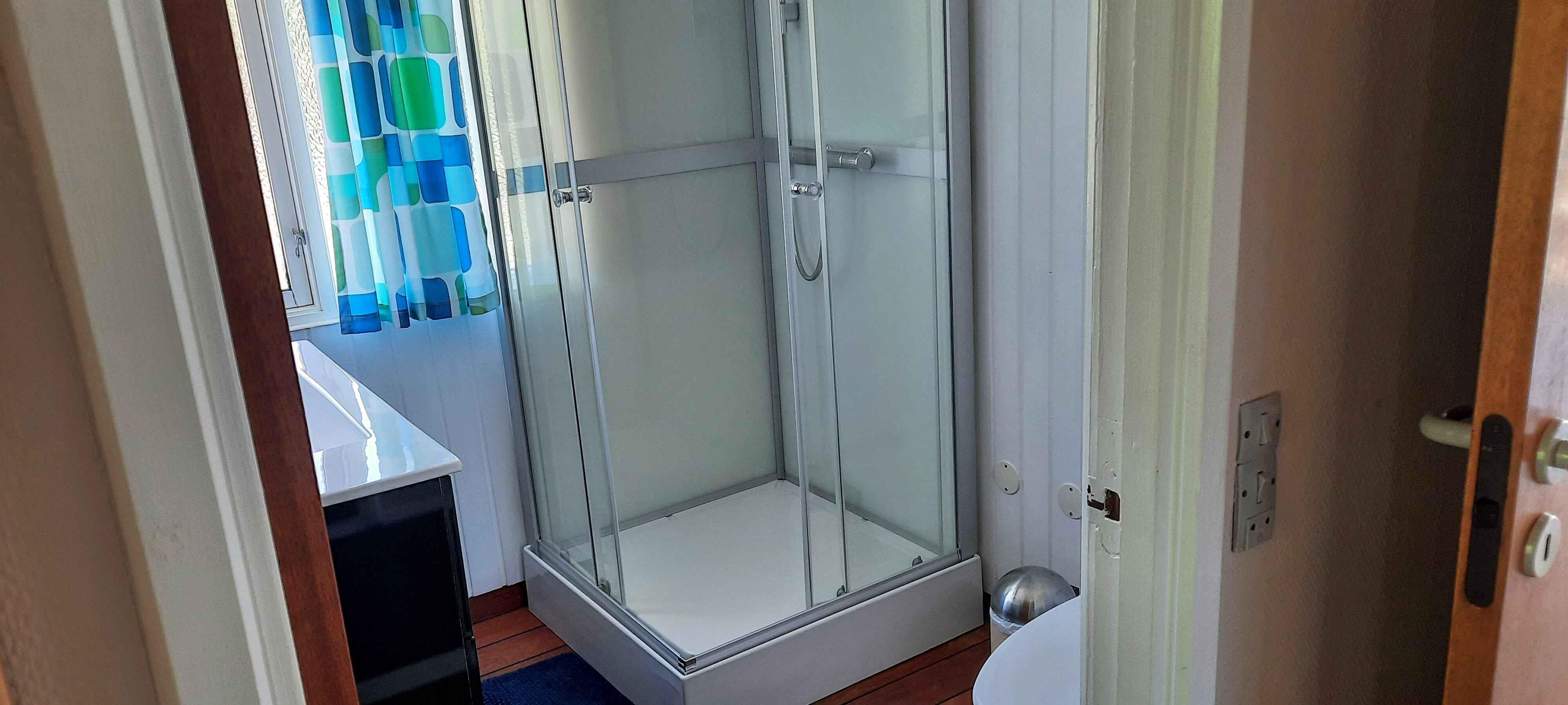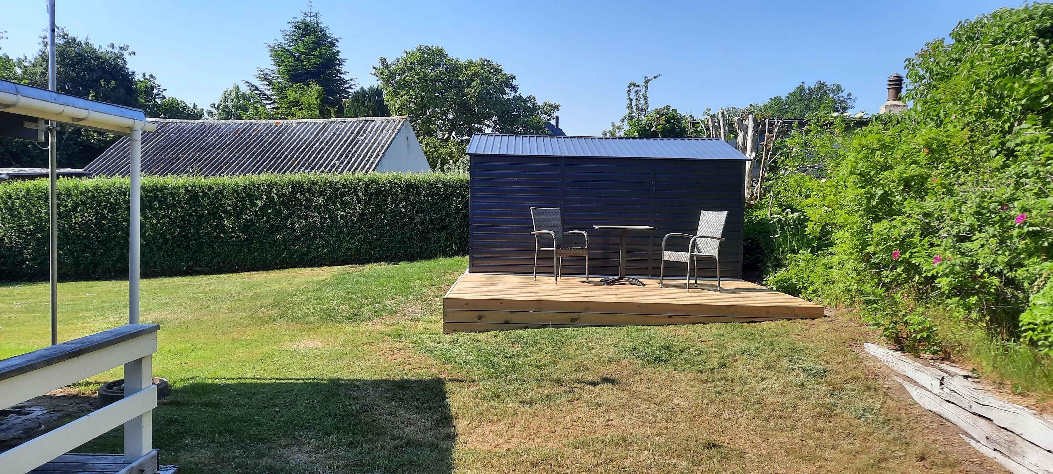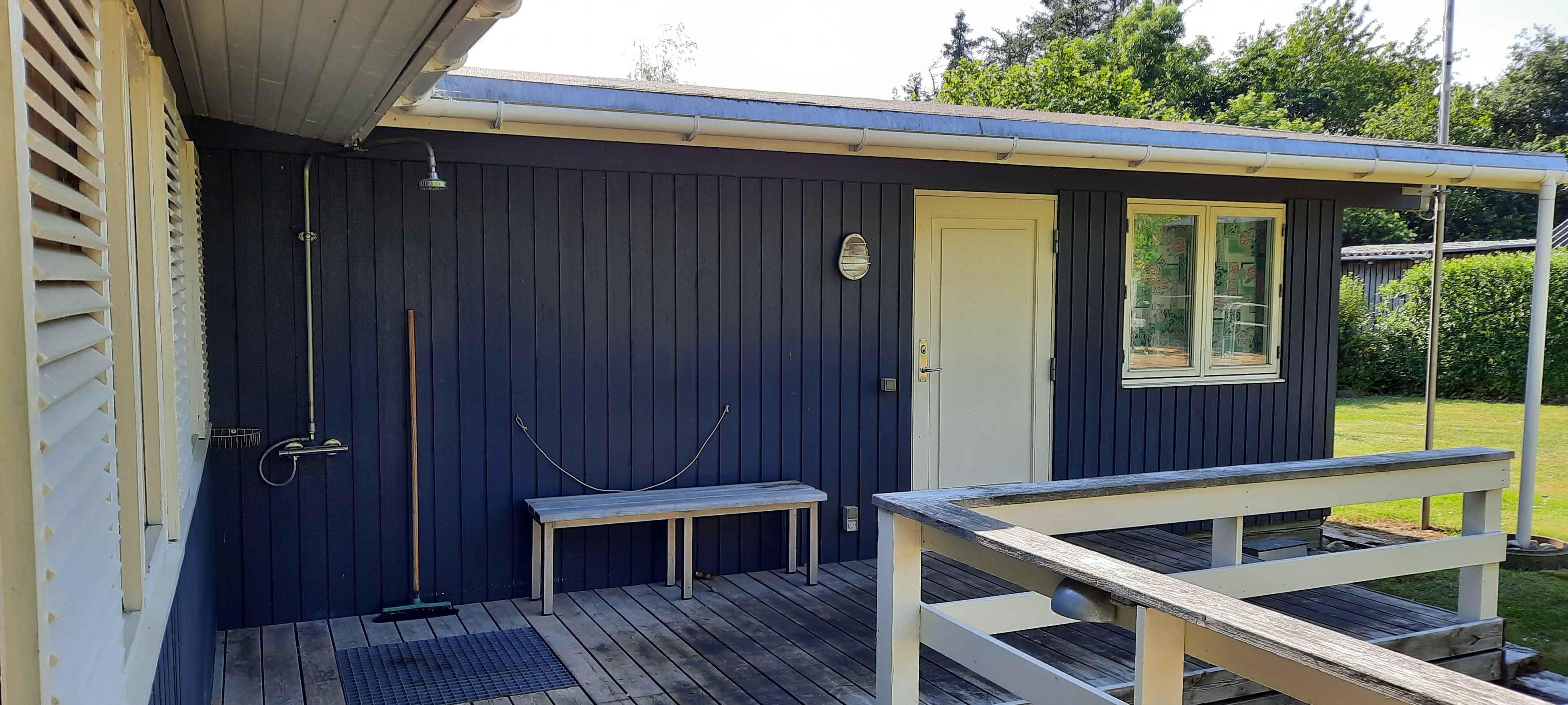 Gemütliches Ferienhaus mit Meerblick, Holzterrasse und Außendusche in ruhiger Lage nahe Strand und Natur.