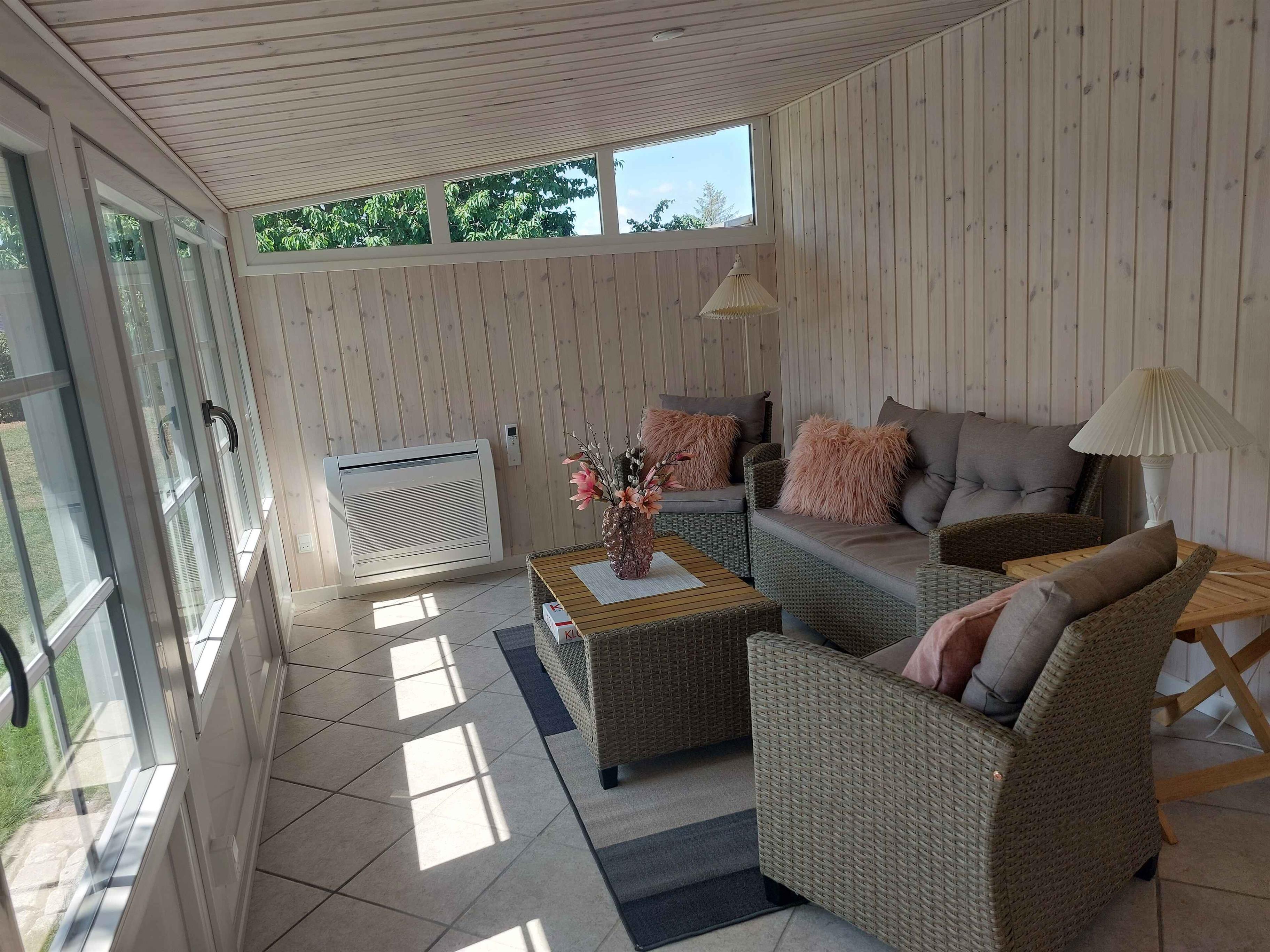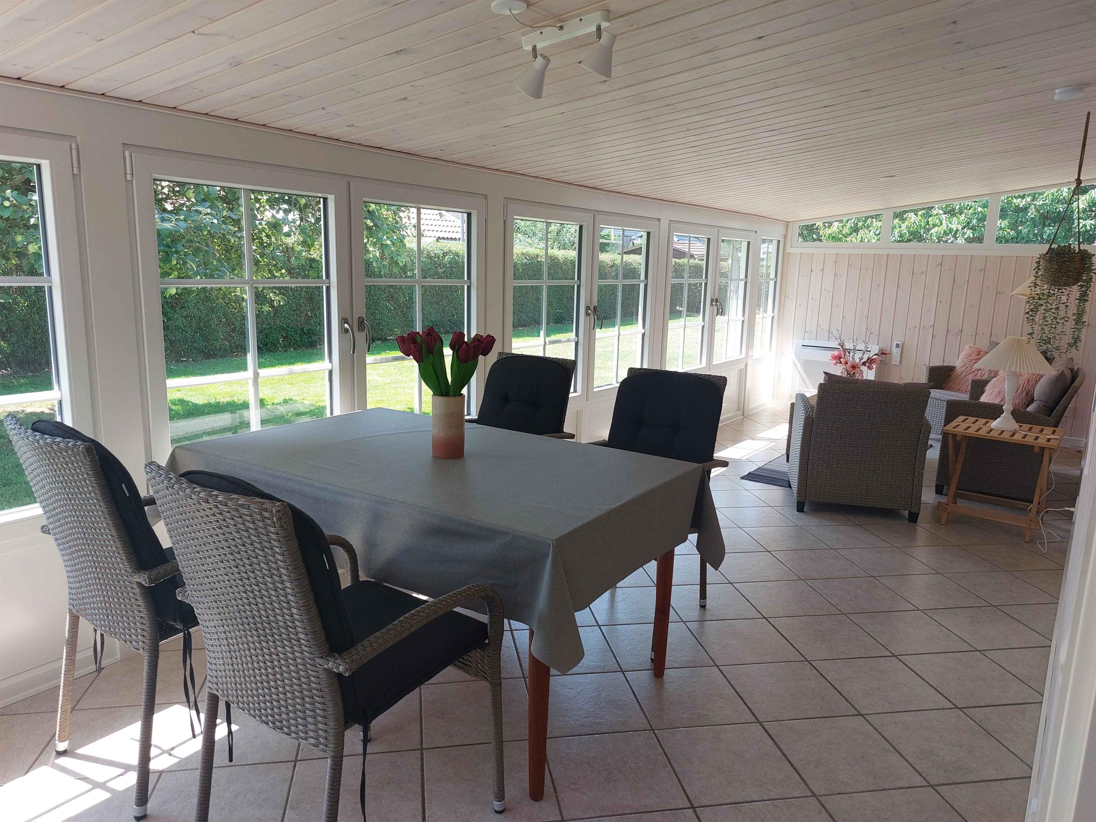 Etwas südlich von Haderslev in Diernæs Strandby liegt dieses schöne, große Ferienhaus nur ca. 400 Meter vom Wasser entfernt. Kostenloses Internet. Es gibt eine 11-kW-Ladestation für Elektroautos. Das Wohnzimmer ist gemütlich eingerichtet und verfügt über einen Fernseher mit Chromecast. Das Haus wird mit Elektroheizung in den Schlafzimmern und im Badezimmer beheizt und hat außerdem eine Wärmepumpe im Wohnzimmer sowie im Wintergarten. Es gibt einen wunderschönen, großen Wintergarten mit herrlichem Blick in den Garten und ins Grüne. Hier befinden sich sowohl eine gemütliche Sitzecke als auch ein Essbereich. Die Küche ist offen mit dem Wohnzimmer verbunden und mit Herd, Kühl-/Gefrierschrank und Geschirrspüler ausgestattet. Das Haus verfügt über 3 schöne Schlafzimmer. Zwei Schlafzimmer sind mit Doppelbetten eingerichtet, das dritte Schlafzimmer mit 2 Einzelbetten. Es gibt ein Badezimmer mit Dusche. Eine Waschmaschine ist ebenfalls vorhanden. Draußen gibt es sowohl eine offene als auch eine überdachte Terrasse. Gartenmöbel, Grill und zwei Liegestühle stehen zur Verfügung. Parkplätze befinden sich auf dem Grundstück. Etwa 300 Meter vom Haus entfernt gibt es einen großen Spielplatz mit Fitnessgeräten im Freien. Die Umgebung hat viel zu bieten. Ca. 15 Minuten nördlich vom Haus liegt das historische Stadtzentrum von Haderslev mit seinen verwinkelten Kopfsteinpflastergassen und dem beeindruckenden Dom. Besuchen Sie die Museen und entdecken Sie Nordeuropas größte Sammlung an Keramik. Pandekagehuset / Genner Hoel / High Park Sønderjylland liegt 7 km vom Haus entfernt und bietet ein besonderes Walderlebnis – hoch oben in den Baumwipfeln. Achtung: Wird nicht für gewerbliche Nutzung vermietet.