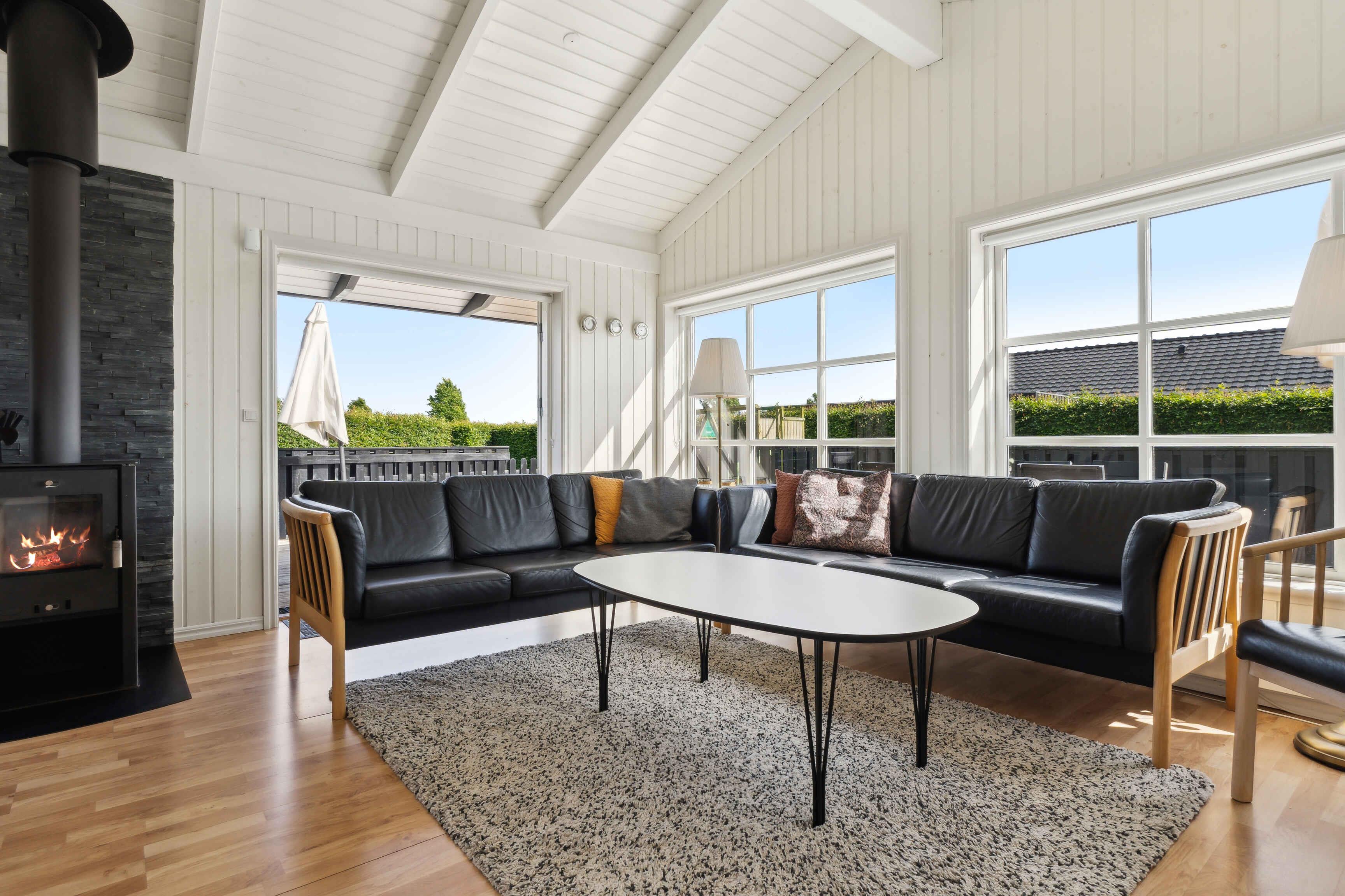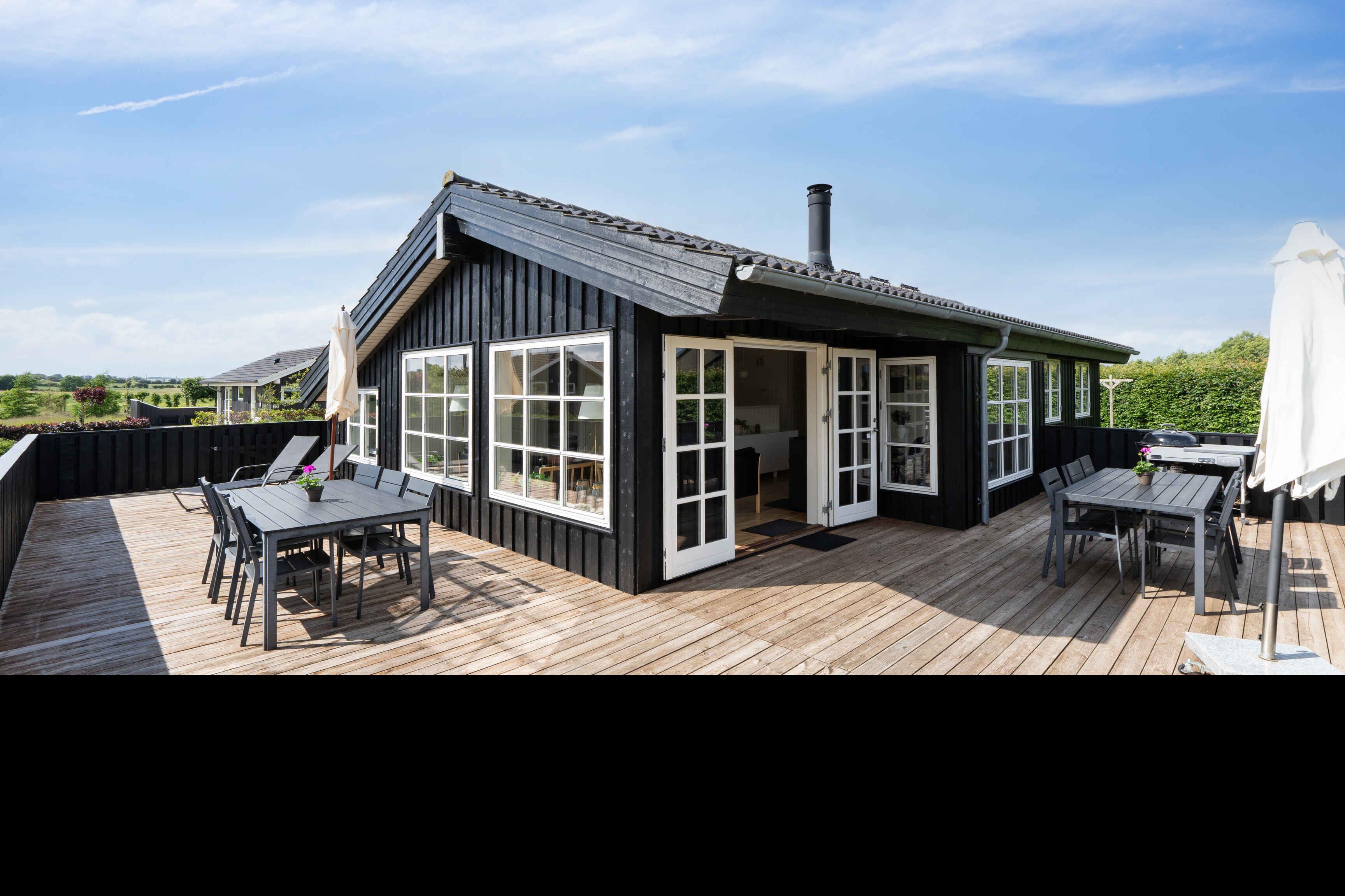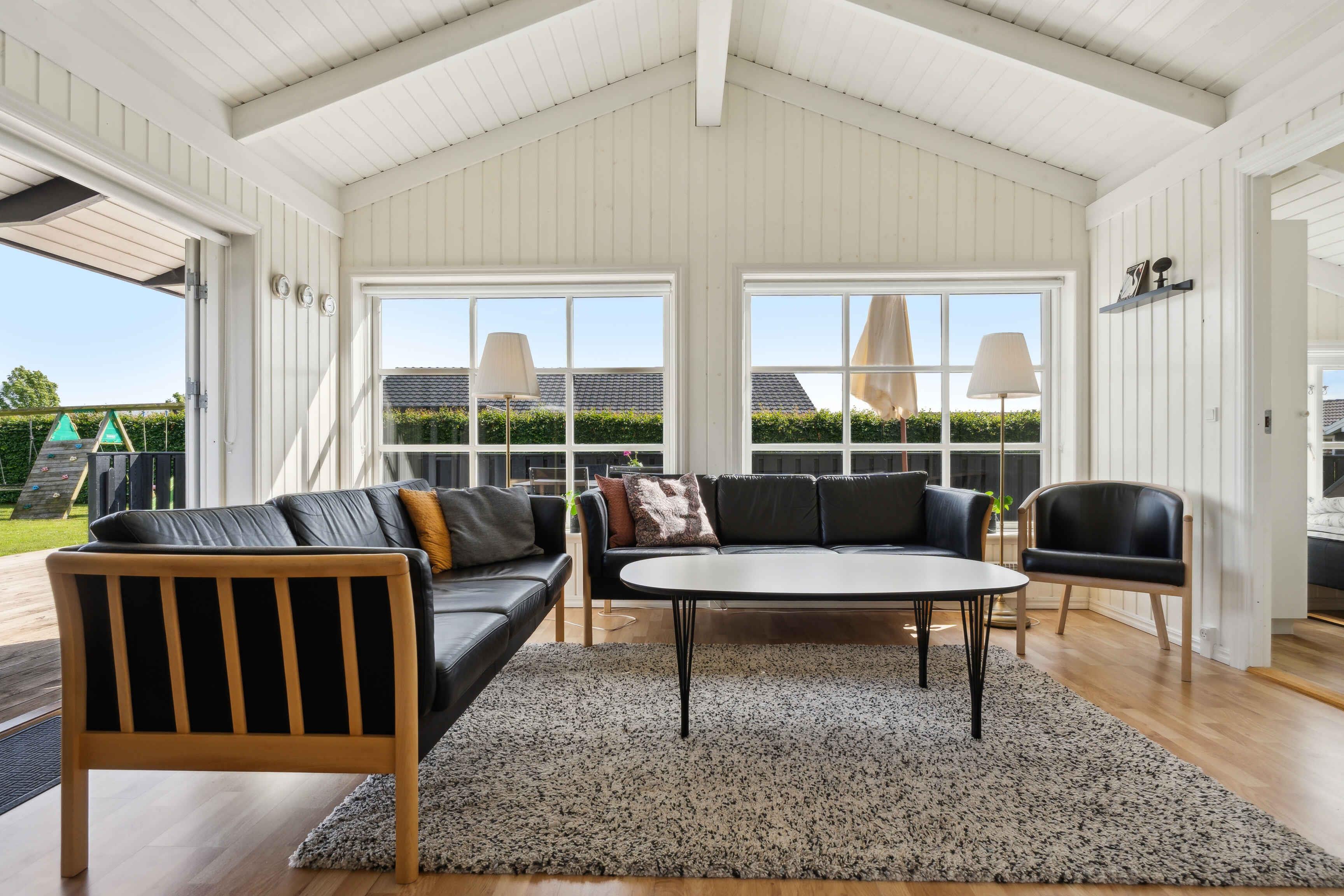 Modernes Ferienhaus mit heller und stilvoller Einrichtung, 4 Schlafzimmern und 2 Badezimmern. Nebengebäude mit Schlafsofa, Tischfußball, Fernseher und Spielkonsole – ideal für Familien und junge Leute.