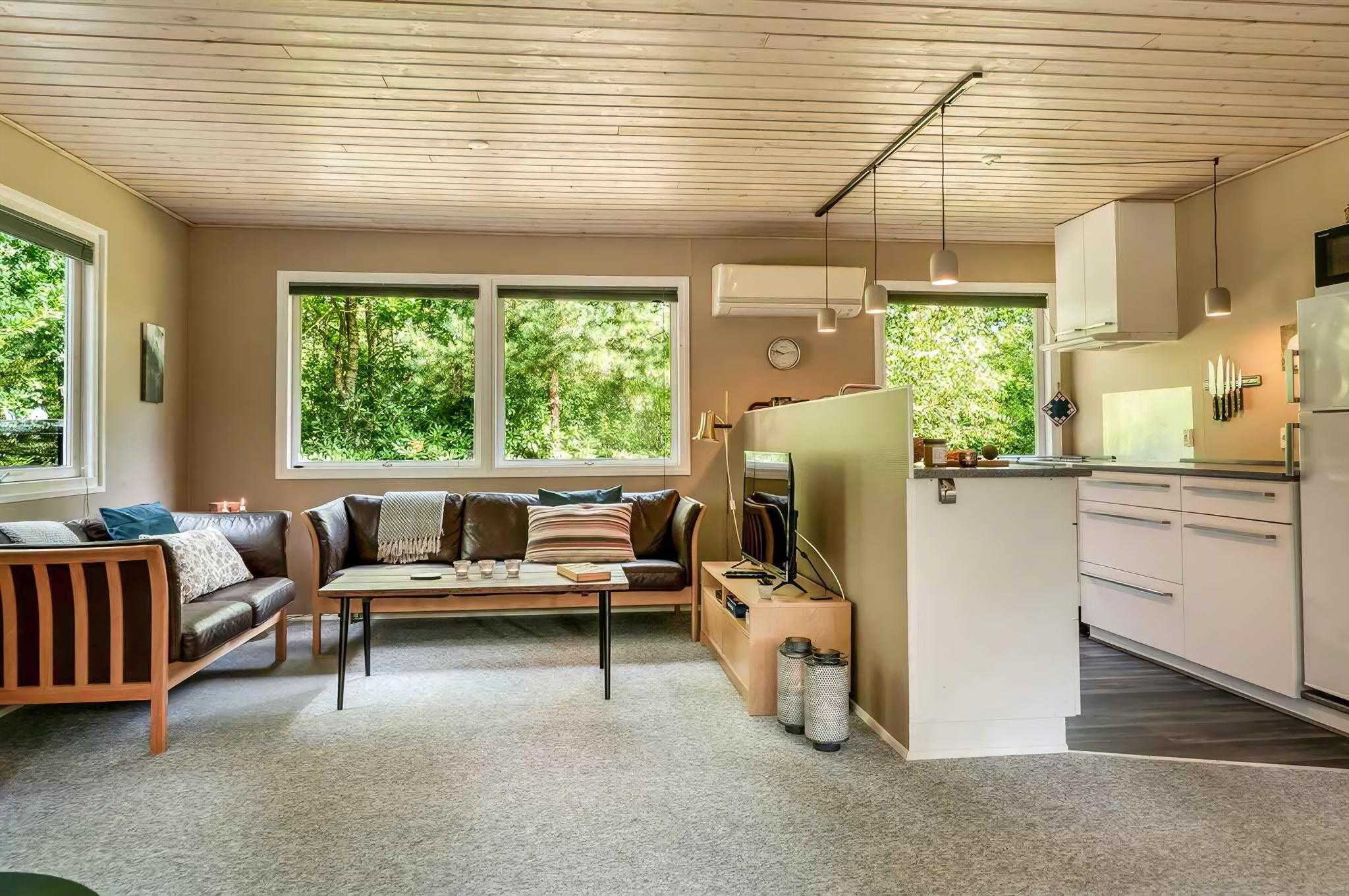 Gemütliches Ferienhaus im Wald nahe Meer und Fjord mit Terrasse, Kaminofen und moderner Ausstattung für entspannte Tage.
