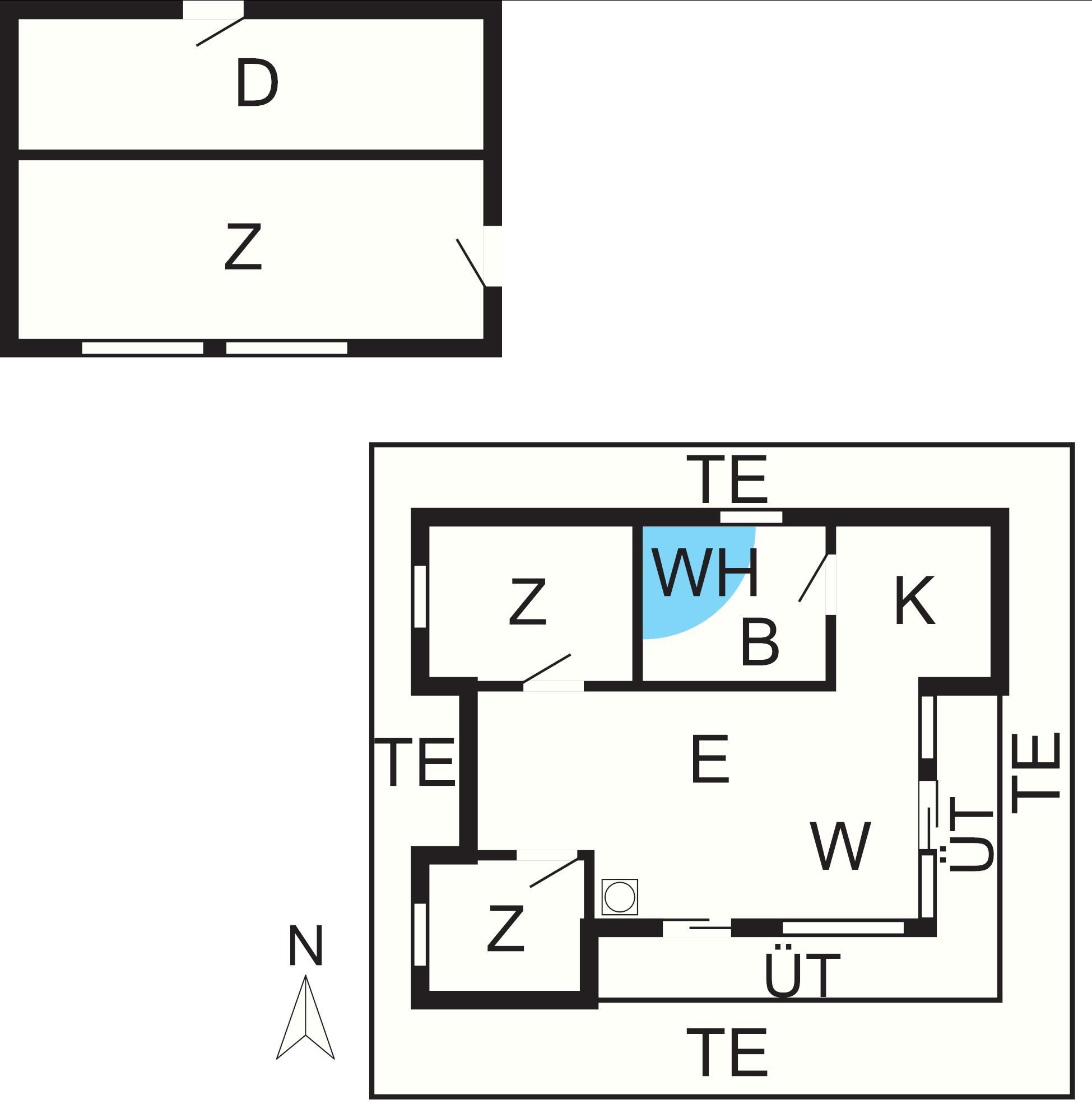 Bad: WC, Waschb., Dusche, Fußbodenheiz.