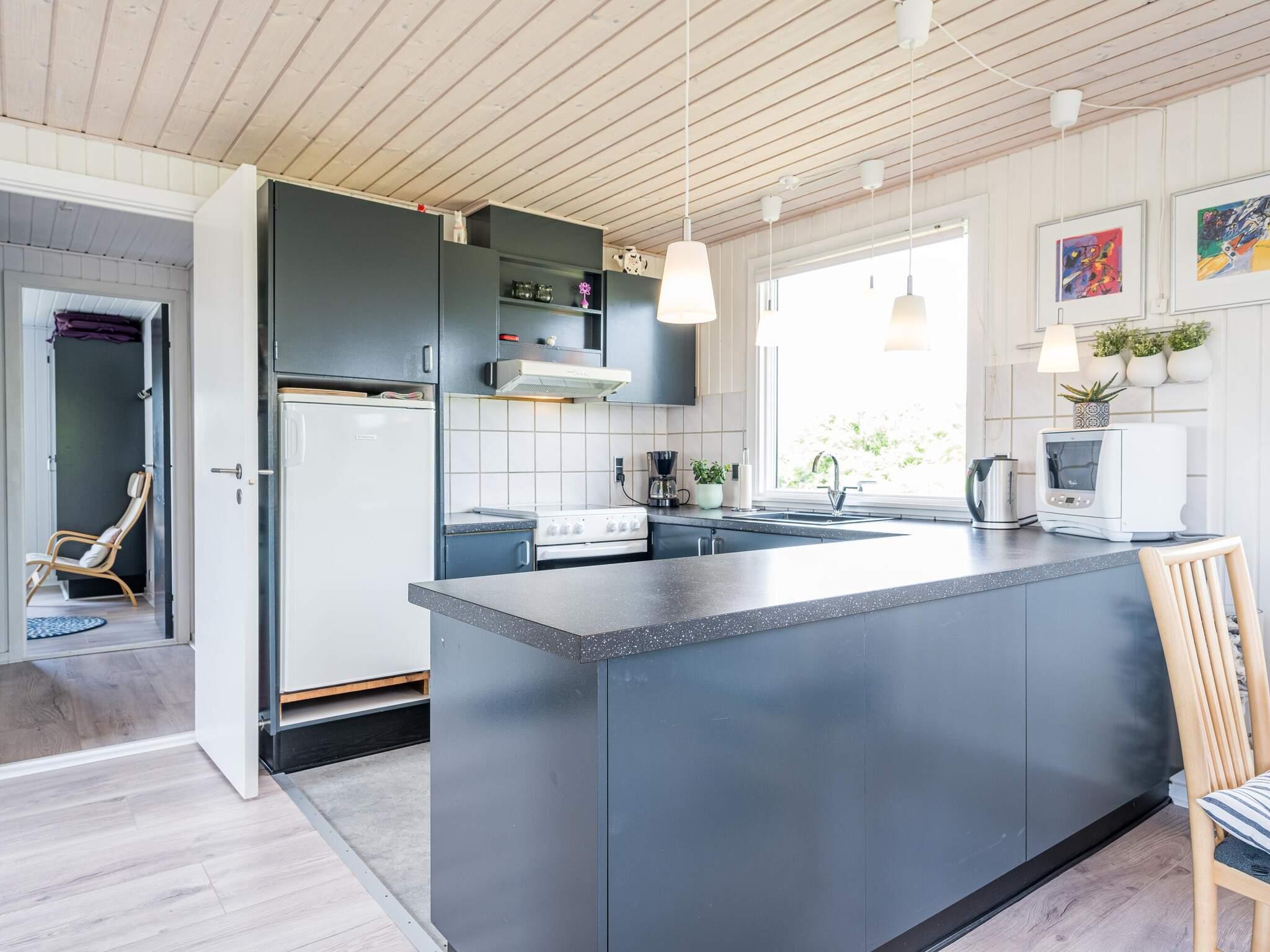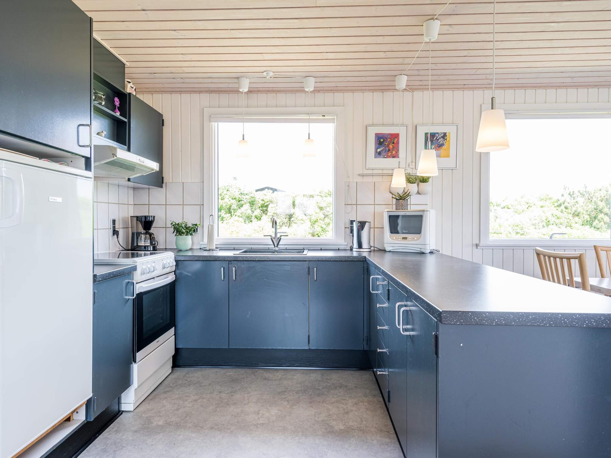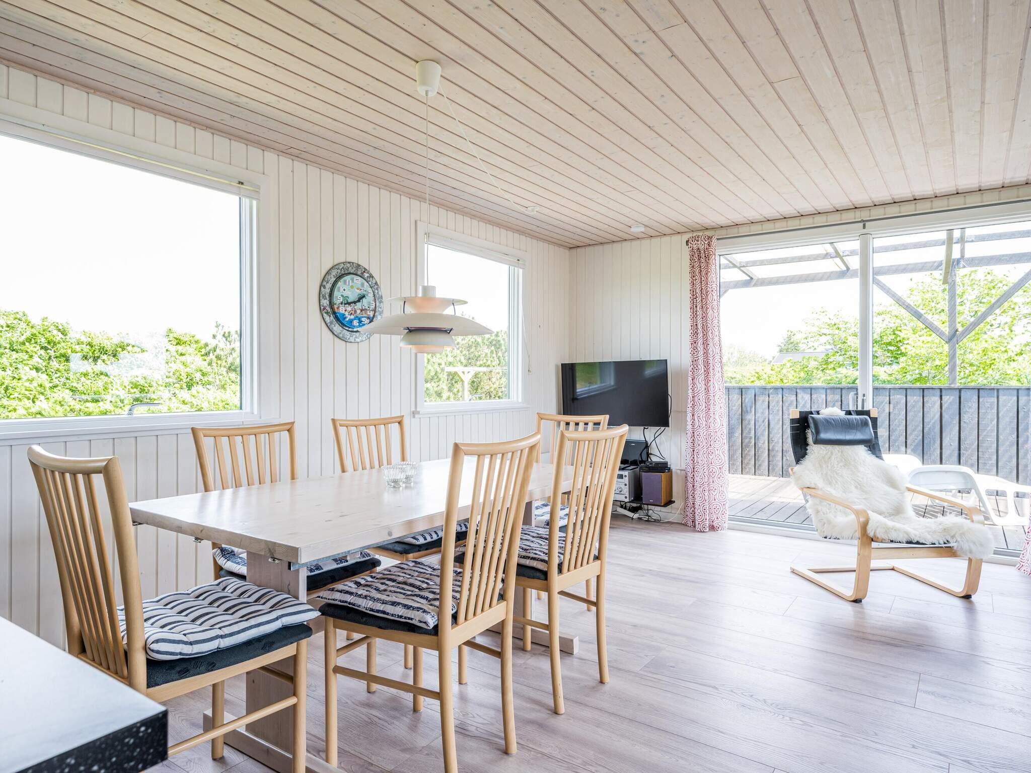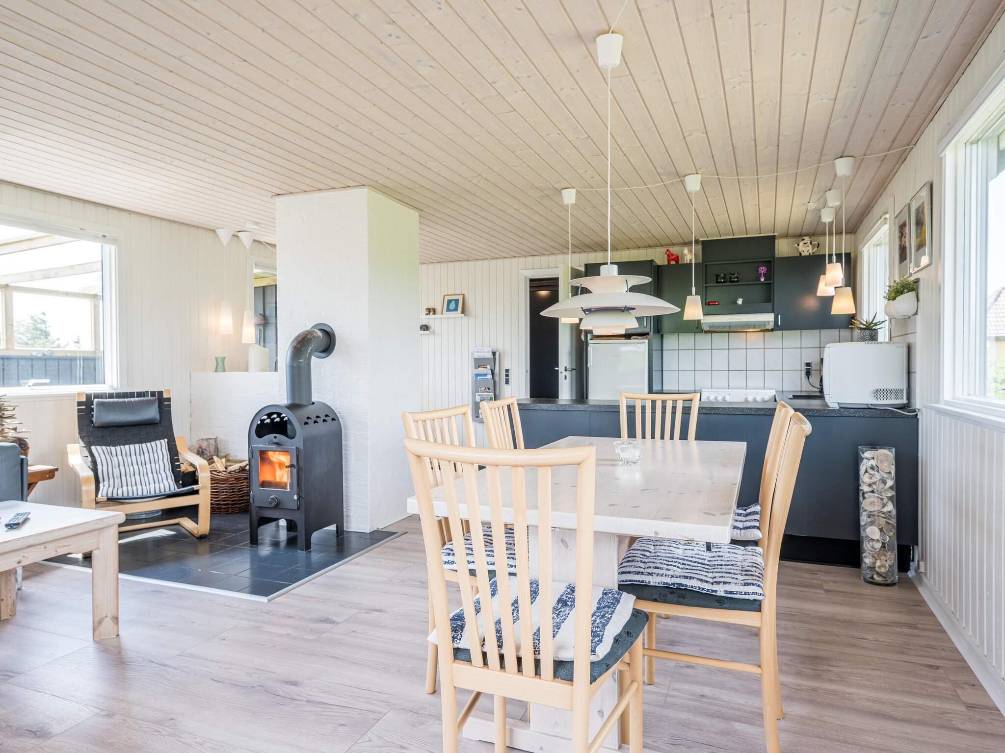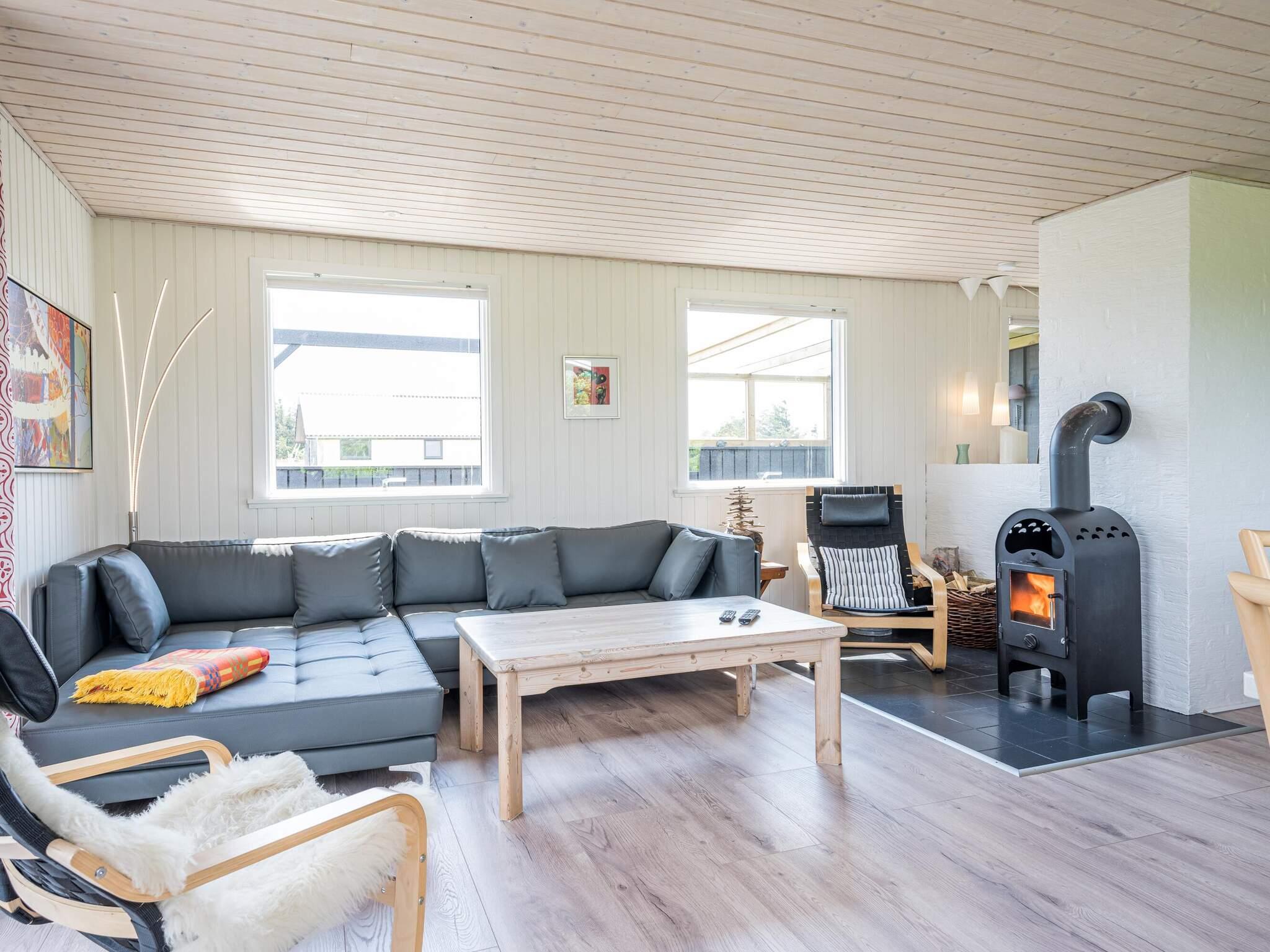 Auf einem schönen, offenen Naturgrundstück in Haurvig an der Nordseeküste steht dieses helles und freundlich eingerichtete Ferienhaus. Offener Küchen-/Wohnbereich mit Ess- und Sitzecke für das Familienleben mit gemütlichem Holzofen in der Mitte, dessen knisterndes Feuer das Haus größtenteils erwärmt. Vom Wohnbereich hat man Zutritt zu einer schön abgeschirmten Terrasse.