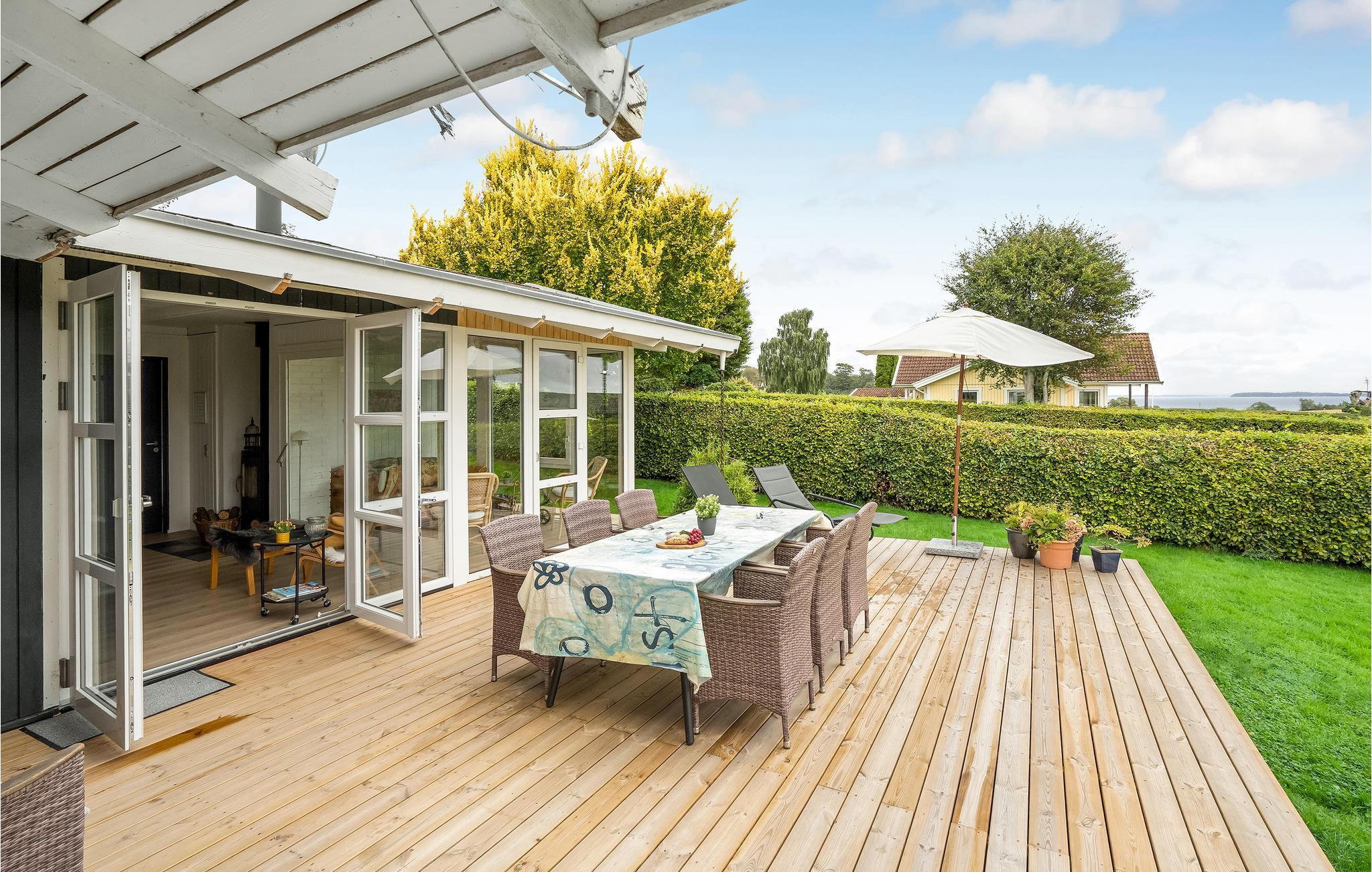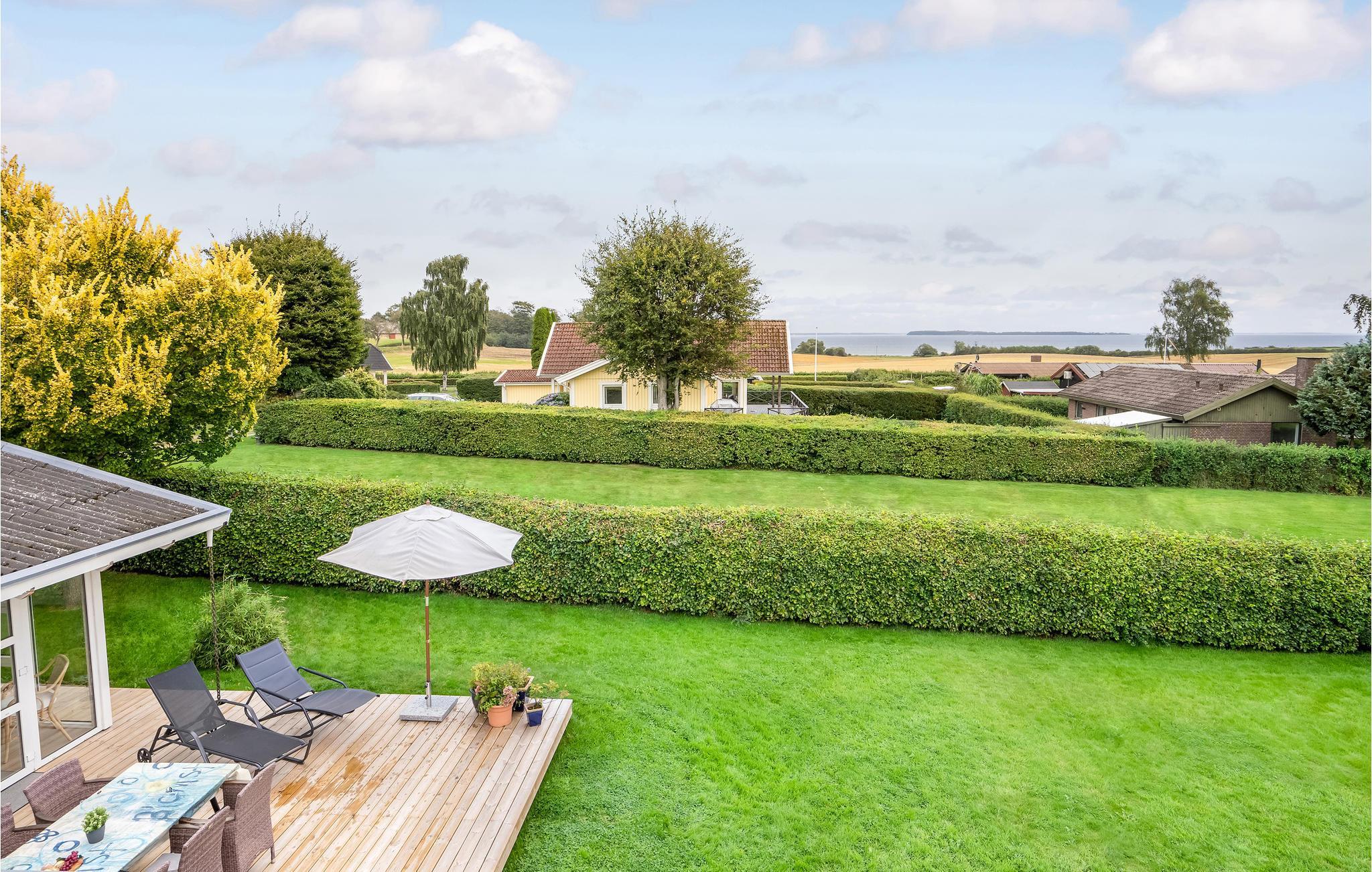 Modernes Holzferienhaus mit Meerblick, Terrasse und naturnahem Garten in Hejlsminde, ideal für erholsame Urlaubstage.