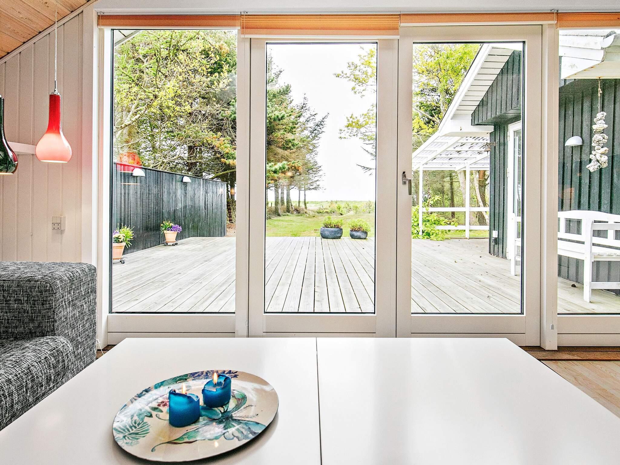 Ferienhaus auf einem Naturgrundstück mit Bäumen, nur 75 Meter vom Limfjord entfernt, mit direktem Ausblick zur Küste bei Helligsø Drag.