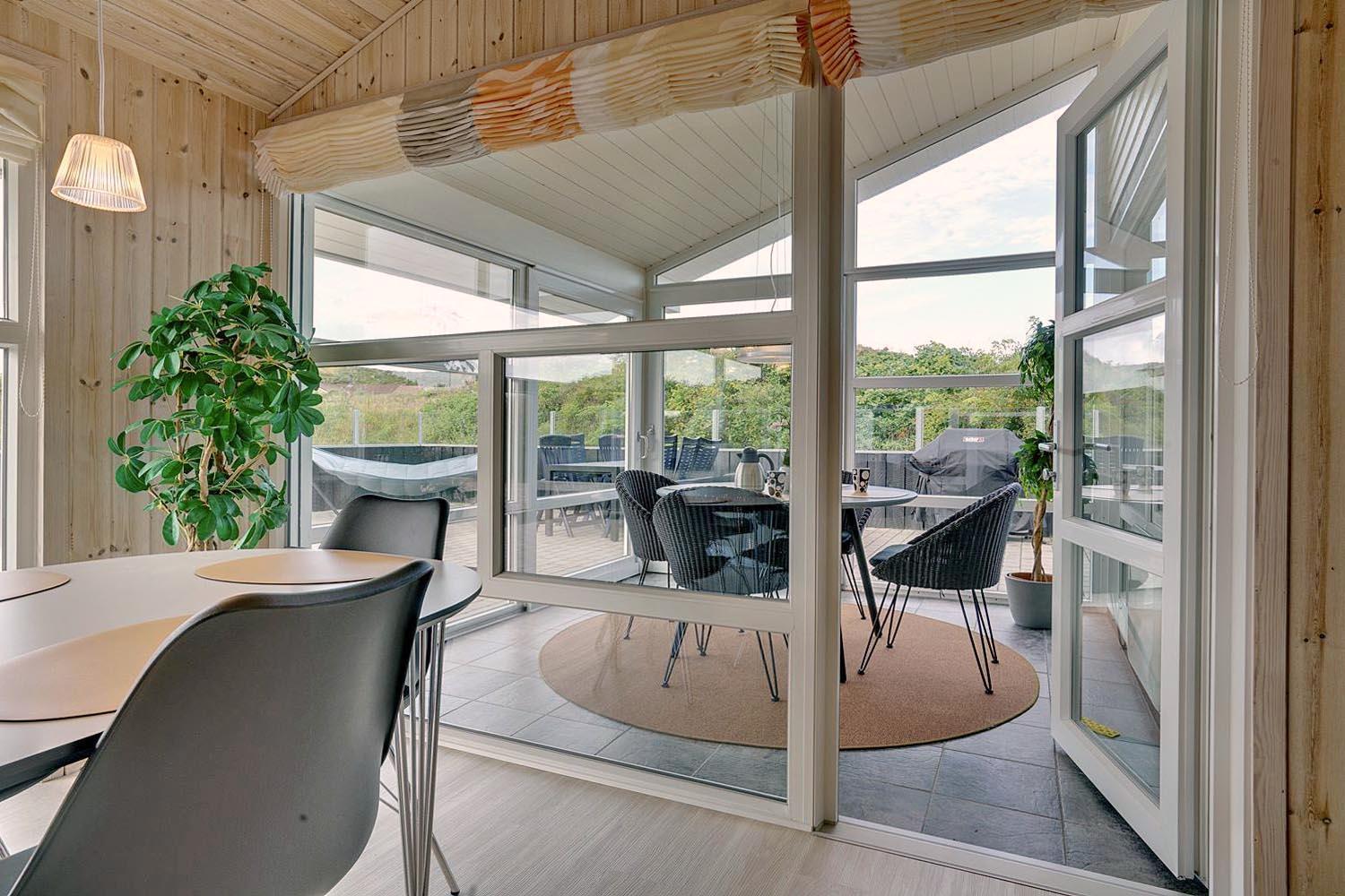 Die Tür in einer der vielen Fensterfronten des Wohnzimmers führt Sie direkt zu einem hellen Wintergarten. Wenn es Sommer ist, können Sie die Tür auch hier zur Seite schieben und eine offene Verbindung bis zur riesigen Terrasse des Hauses herstellen.