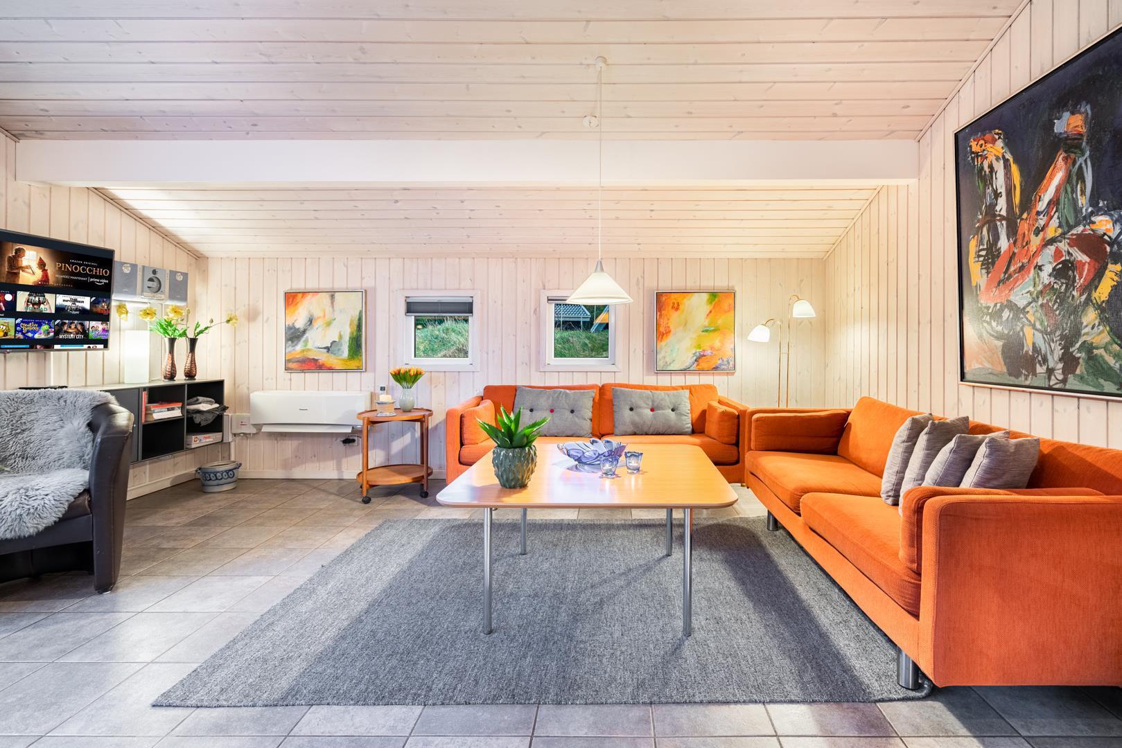 Tolles Ferienhaus auf einem schönen Naturgrundstück mit Platz für Ballspiele. Das Haus befindet sich in ruhiger Umgebung nicht weit von der Blåbjerg Plantage und dem 18-Loch-Golfplatz. Das geschlossene Grundstück liegt am Ende einer Sackgasse. Am Haus befindet sich eine große, teilweise überdachte, ungestörte Terrasse. Die gesamten Türen des Hauses habe eine Breite von 80cm damit alle Räume auch für Rollstuhlfahrer zugänglich sind. Die Böden des Hauses sind mit Fliesen ausgelegt. Die schöne, offene Küche ist mit dem Essbereich kombiniert. Vom Essbereich hat man direkten Zugang zur Terrasse. Gute Schlafräume mit ausreichend Schrankplatz.