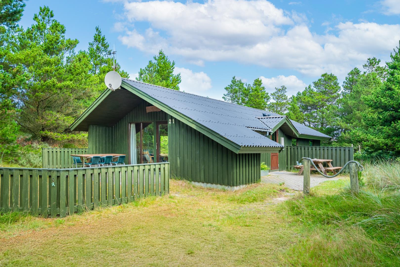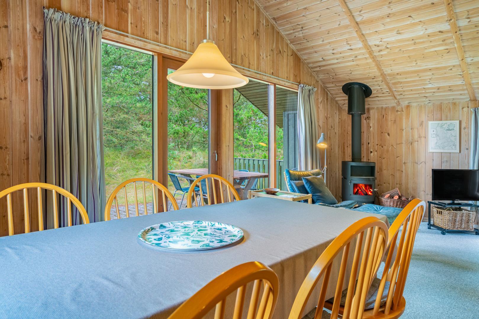 Gemütliches Holzferienhaus in Henne Strand mit WLAN, Kaminofen und zwei Terrassen, umgeben von Nadelbäumen und nah am Meer.