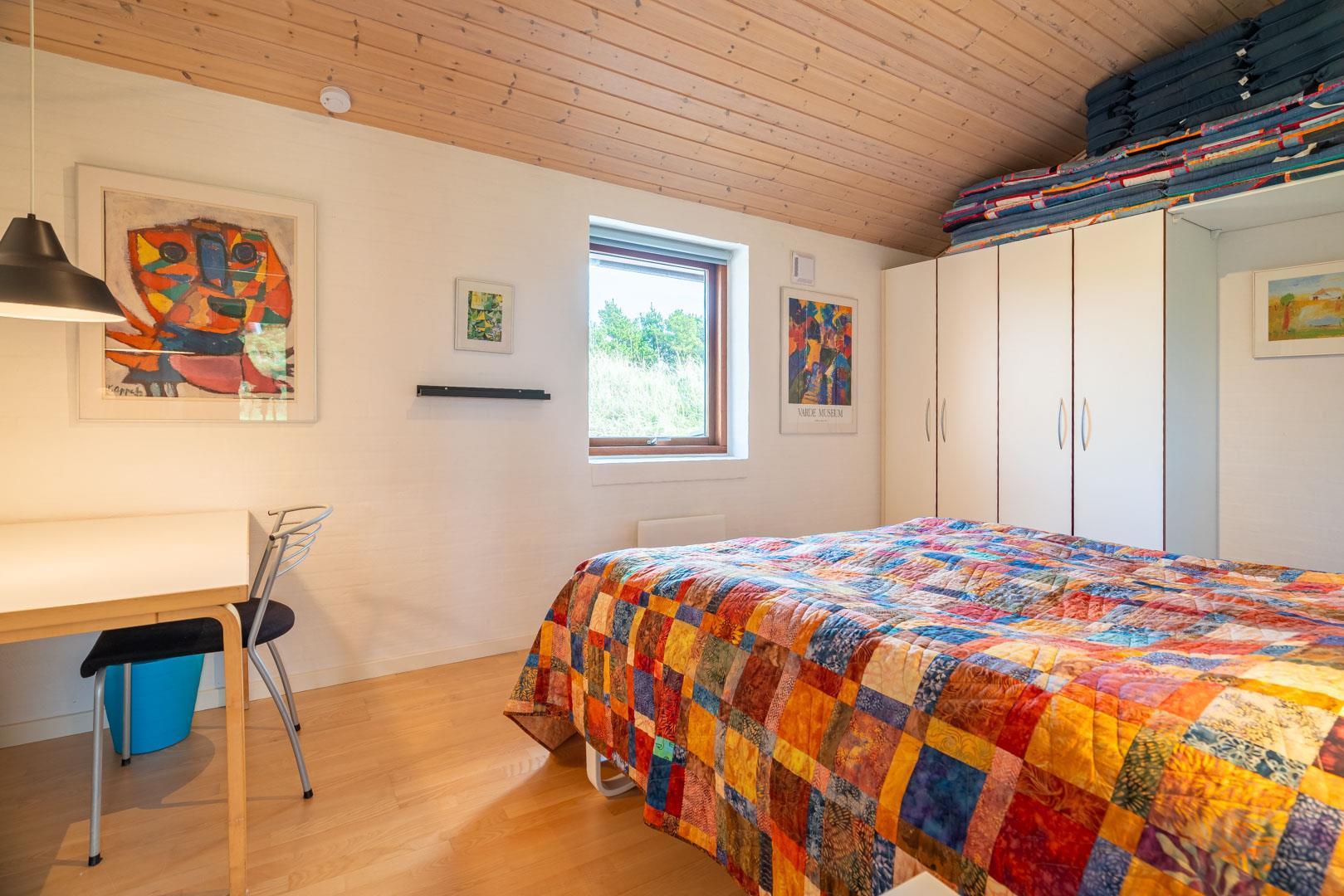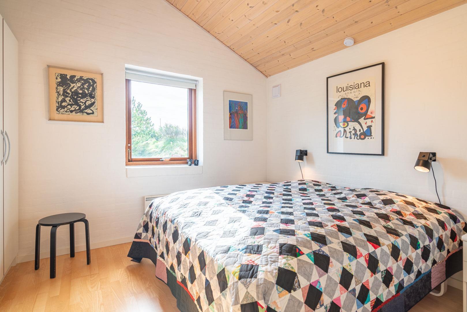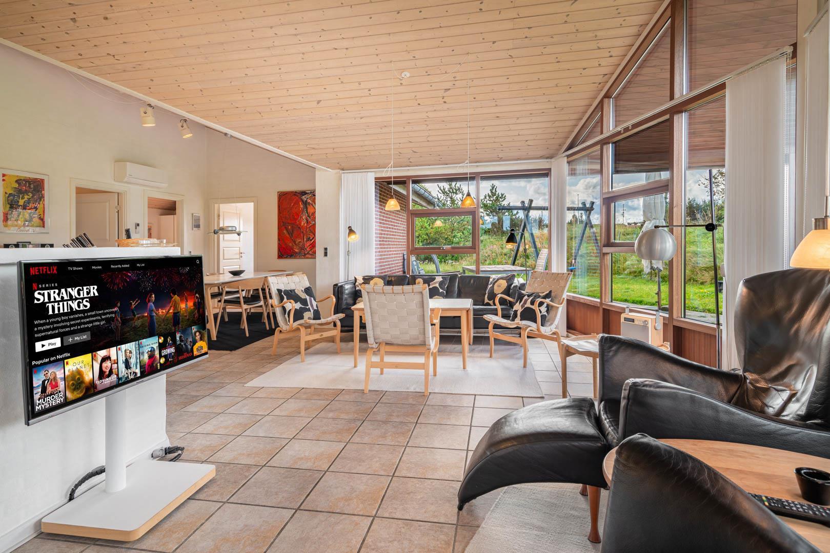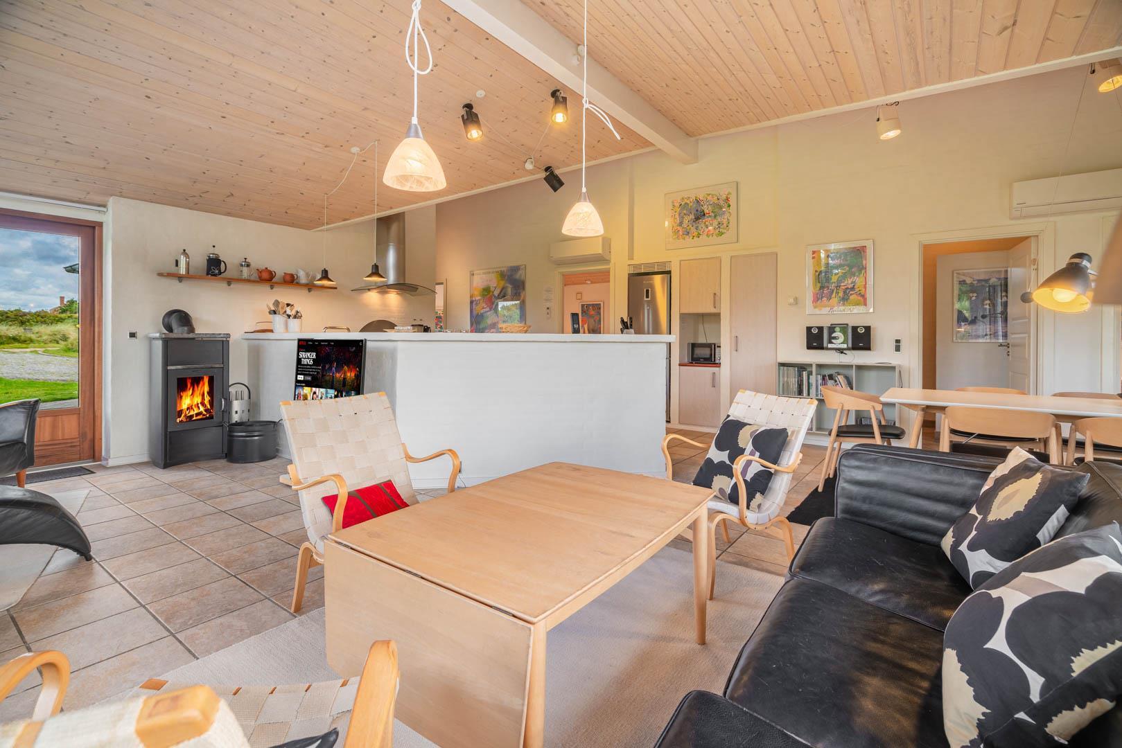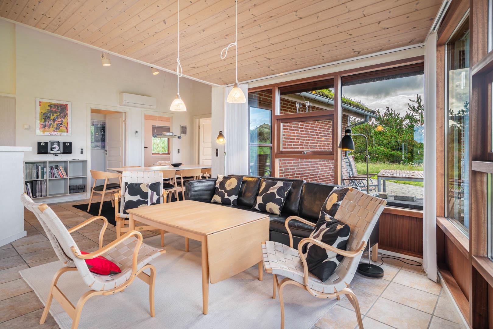 Der Wohnbereich ist freundlich eingerichtet und durch die große Fensterfront lichtdurchflutet. Die offene Küche ist funktional ausgestattet und in den Wohnraum integriert, sodass gemeinsame Zeit beim Kochen und Essen genossen werden kann. Das Ferienhaus verfügt über vier Schlafzimmer: Drei Zimmer mit Doppelbetten sowie ein Zimmer mit zwei Einzelbetten. Die Schlafräume sind mit Holzfußböden ausgestattet und bieten ausreichend Platz für Familien.