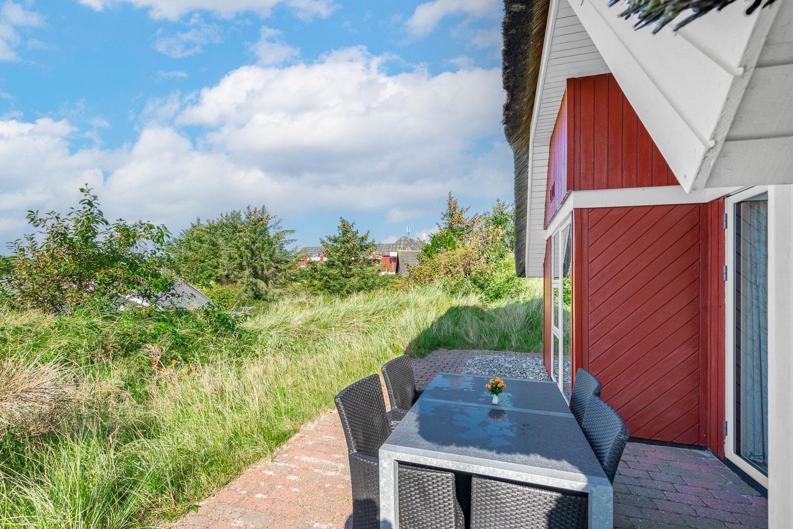 Dieses helle Reetdachferienhaus in Henne Strand bietet Sauna, Whirlpool und mehrere Terrassen für erholsame Tage am Meer.