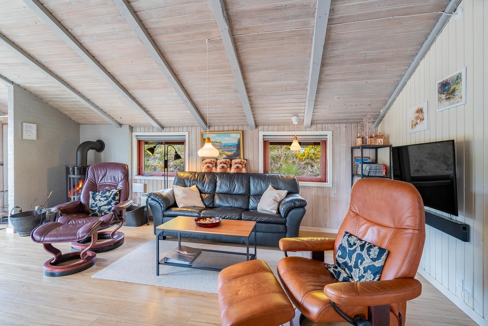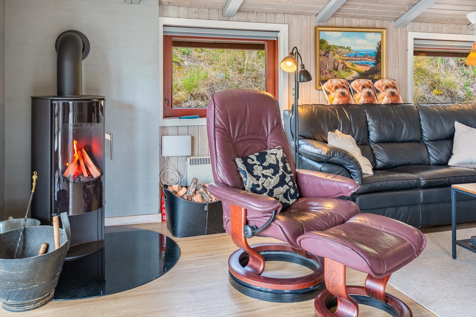 Der Innenbereich des Ferienhauses im Timianvej 13 bietet Dir auf 92 m² viel Platz zum Wohlfühlen. Der helle Wohnbereich mit Kamin schafft eine gemütliche Atmosphäre – ideal für entspannte Abende nach einem Tag am Strand. Dank Wärmepumpe ist das Ferienhaus zu jeder Jahreszeit angenehm temperiert.