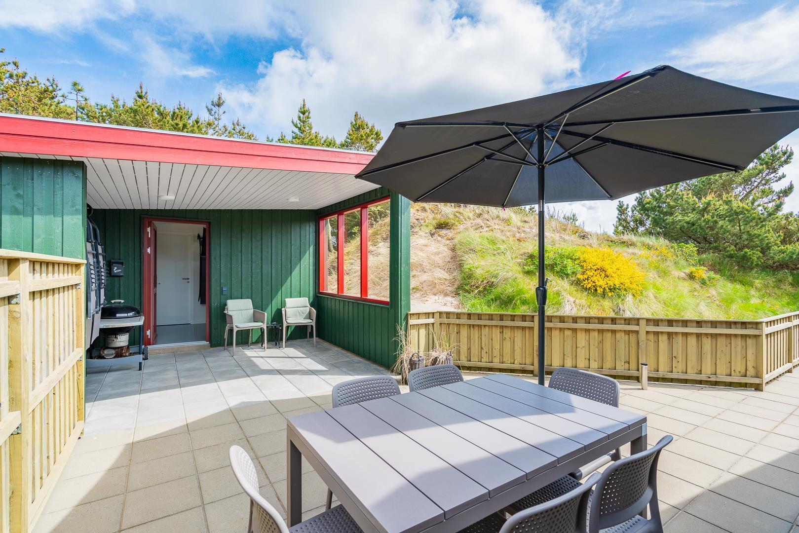 Der Außenbereich des Ferienhauses auf der Timianvej 13 in Henne Strand ist ideal für erholsame Urlaubstage an der Nordsee. Auf der geschlossenen Terrasse kannst Du entspannt draußen sitzen – perfekt für Urlaub mit Hund oder kleinen Kindern. Die zusätzliche überdachte Terrasse bietet Schutz vor Wind und Wetter und macht gemütliche Stunden im Freien fast zu jeder Jahreszeit möglich.